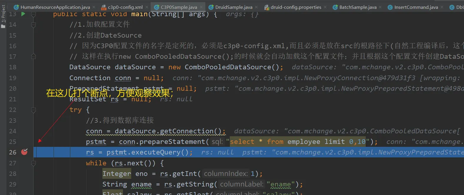 (1) 【1.加载配置文件】和【2.创建DateSource】只需一条代码就能完成:【DataSource dataSource = new ComboPooledDataSource();】