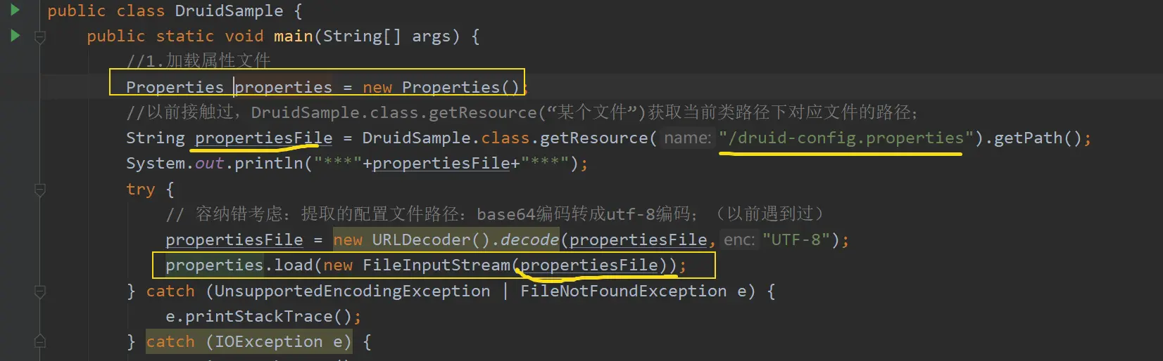 (1) 【String propertiesFile = DruidSample.class.getResource(“/druid-config.properties”).getPath();】DruidSample.class.getResource(“某个文件”)获取当前类路径下对应文件的路径;同时,也对获取到的路径字符串转化了编码方式;(前台系统二这篇博客中的XmlDataSource类部分有类似内容)