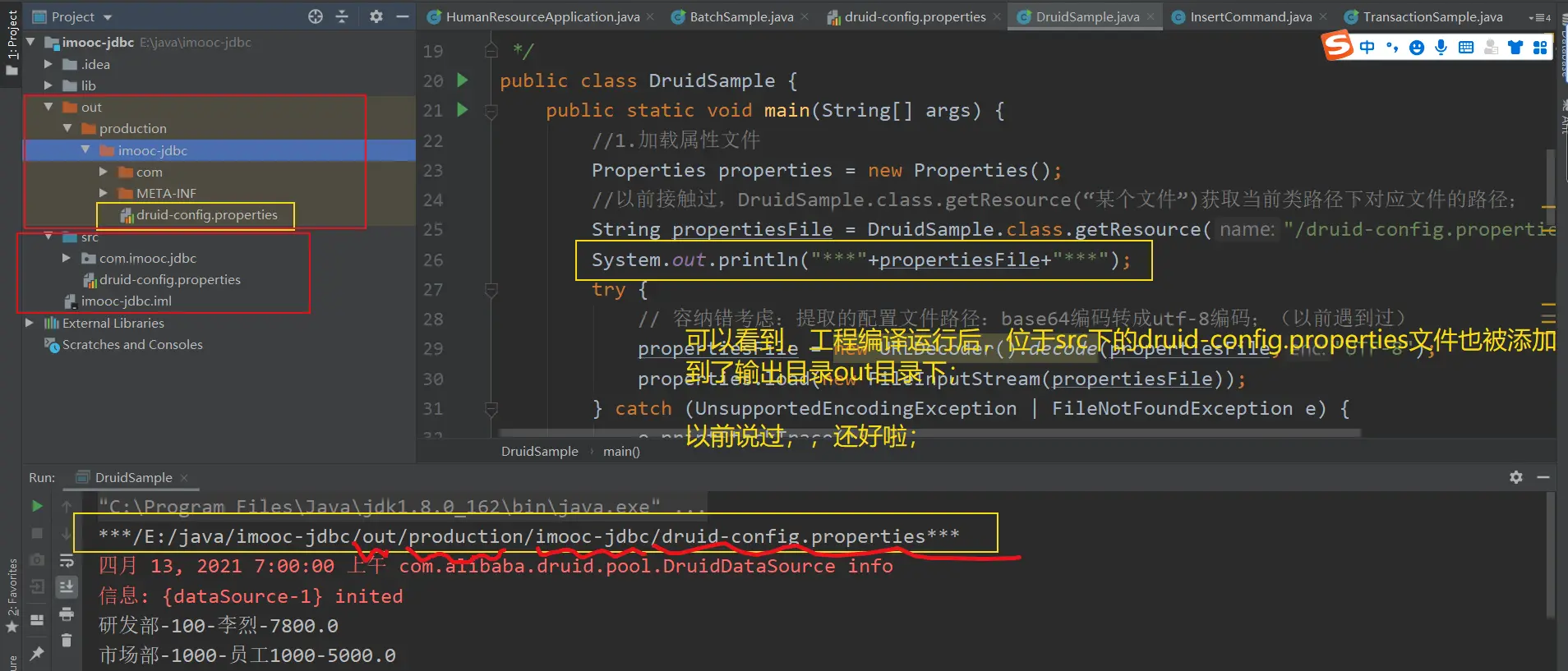 DruidSample类:(1)加载属性文件;(2)获取DataSource数据源对象;(3)创建数据库连接。