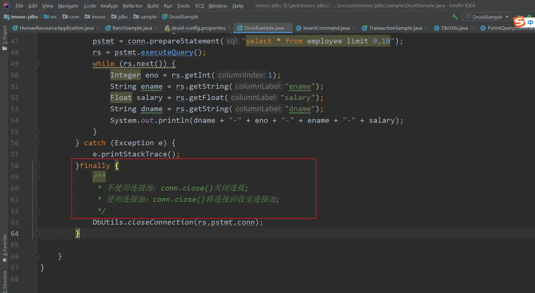 (4) 一切就绪之后,当程序中需要数据库连接的时候,直接使用【conn = dataSource.getConnection();】从数据库连接池中去取一个连接就可以了;;;;;;而不用再使用【Connection conn = DriverManager.getConnection(“jdbc:mysql://localhost:3306/imooc?useSSL=false&useUincode=true&characterEncoding=utf-8&serverTimezone=Asia/Shanghai&allowPublicKeyRetrieval=true”,“root”, “12345”);】去现创建数据库连接了;