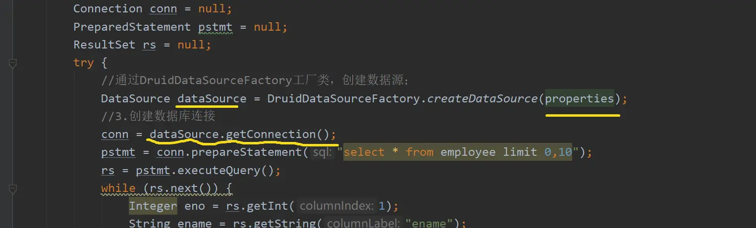 (2) 然后,在程序中,通过Properties类读取那个配置文件,然后通过Druid提供的工厂类DruidDataSourceFactory去记载读取的配置文件,就能得到DataSource数据源对象;
