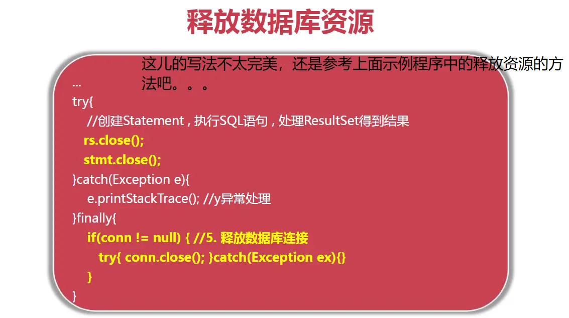 if (stmt != null) { // 如果rs != null,代表stmt被实例化了,所以这儿需要关闭一下,进行释放;