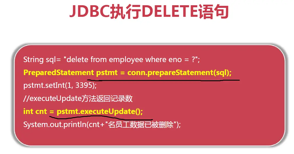 (2)executeUpdate()方法的返回值也是本次删除操作所影响的数据库的行数;可能返回1,也可能返回0(表示本次删除操作没有删除任何一条数据);