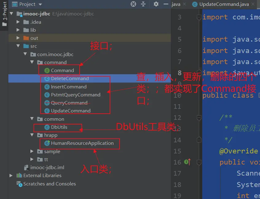 Command command = null;// 将接口变量定义在外边,并初始化为null;在内部遇到不同操作的时候,再去实例化与之对应的类;