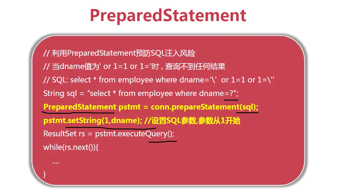 (4) 总结一下:即 PreparedStatement根本就是,在SQL执行前进行参数化的处理,通过?将原有需要传入变量的部分,变成在下面通过set***(1,dname)通过参数进行传入的形式,同时对参数中的特殊字符进行转义的处理;