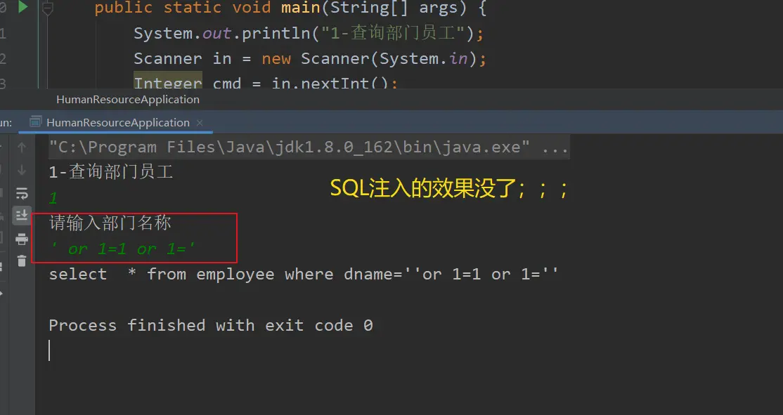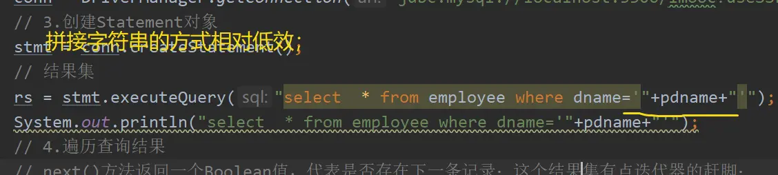 (1)如果采用字符串拼接的方式(即Statement的方式):【String sql = “select * from employee where dname=’“+pdname+”’”;】