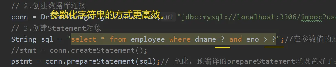 (2)采用参数化字符串的方式(即PrepareStatement的方式):【String sql = “select * from employee where dname=? and eno > ?”;】