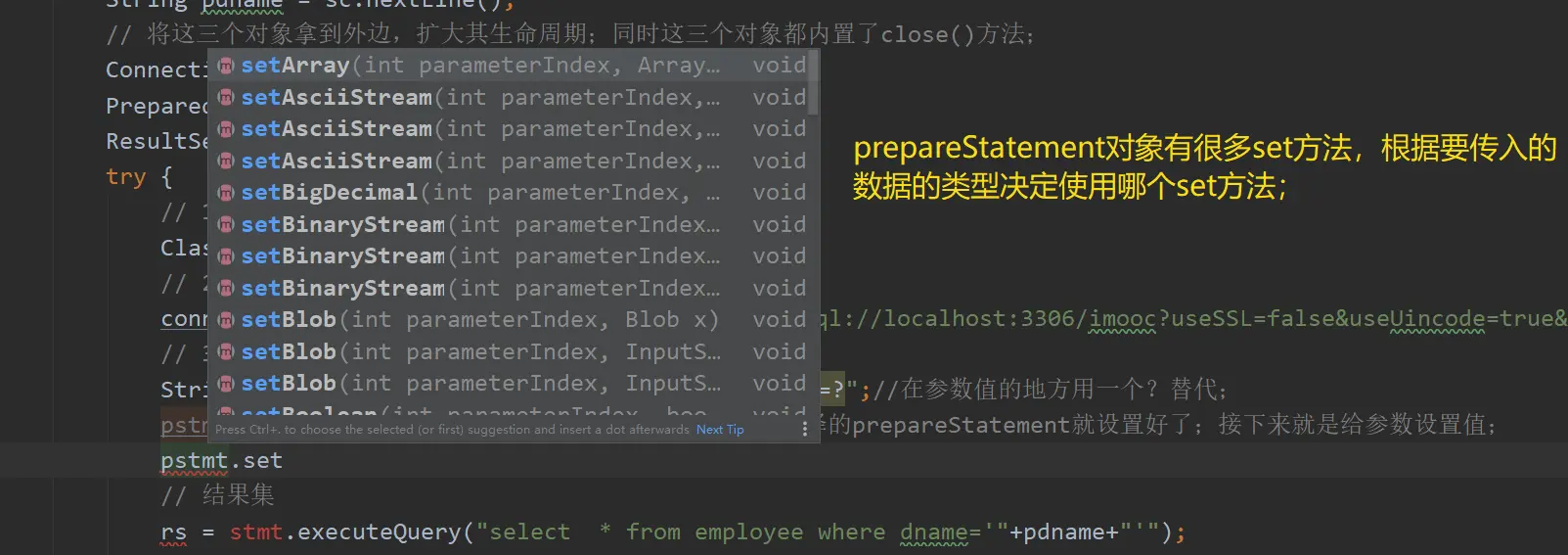 (2) 【setString(1,dname)】中的1代表传入第一个参数,值为dname;