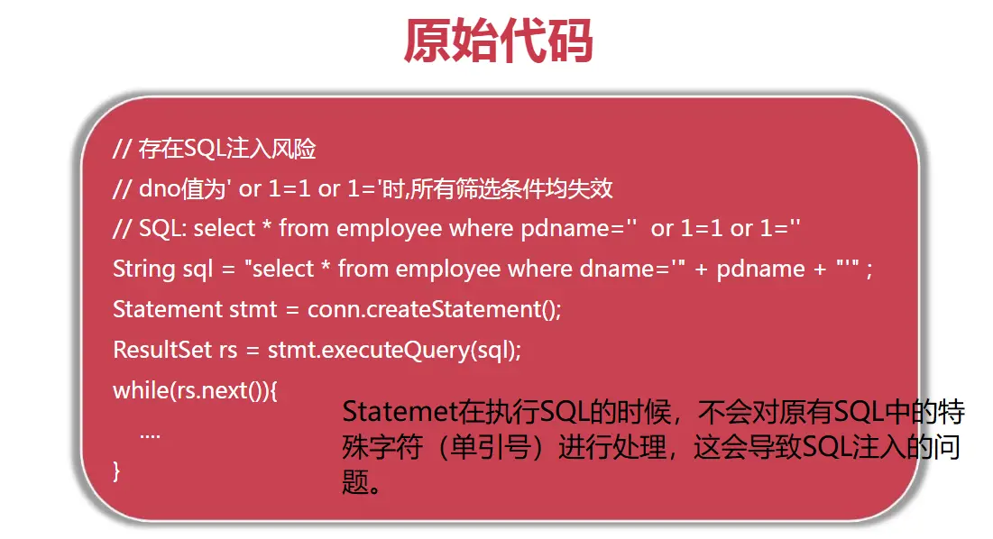 ● 在实际中,pdname就会被实际的值所替换,即比如查询市场部的时候,sql字符串就是【String sql = “select * from employee where dname=‘市场部’”;】在执行的时候,这条sql字符串是需要被解析才能执行的;
