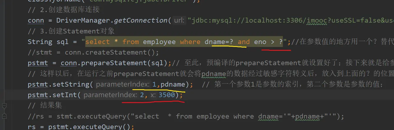 String sql = "select * from employee where dname=? and eno > ?";//在参数值的地方用一个?替代;在传输数值的地方不需要写单引号啦;