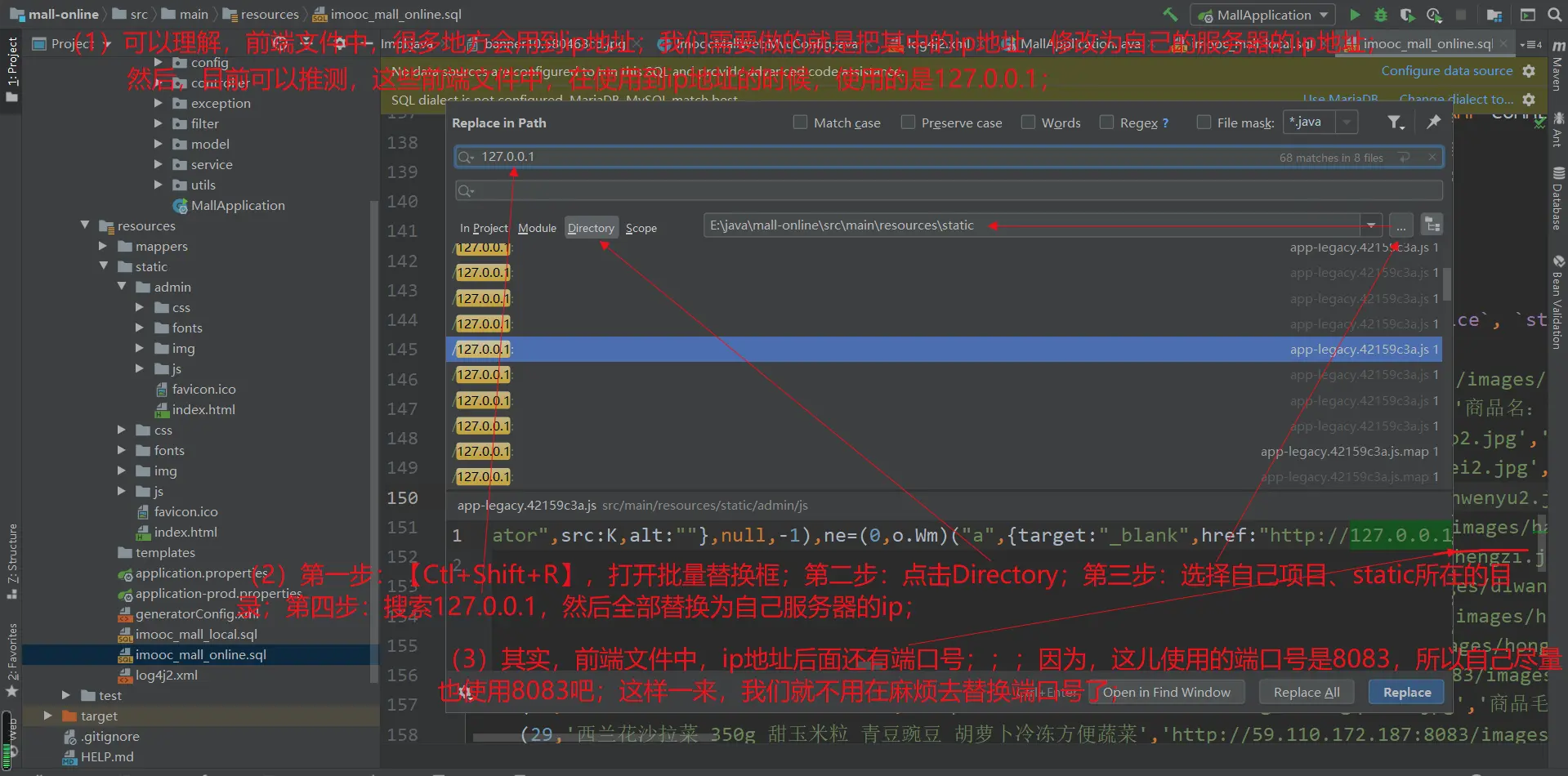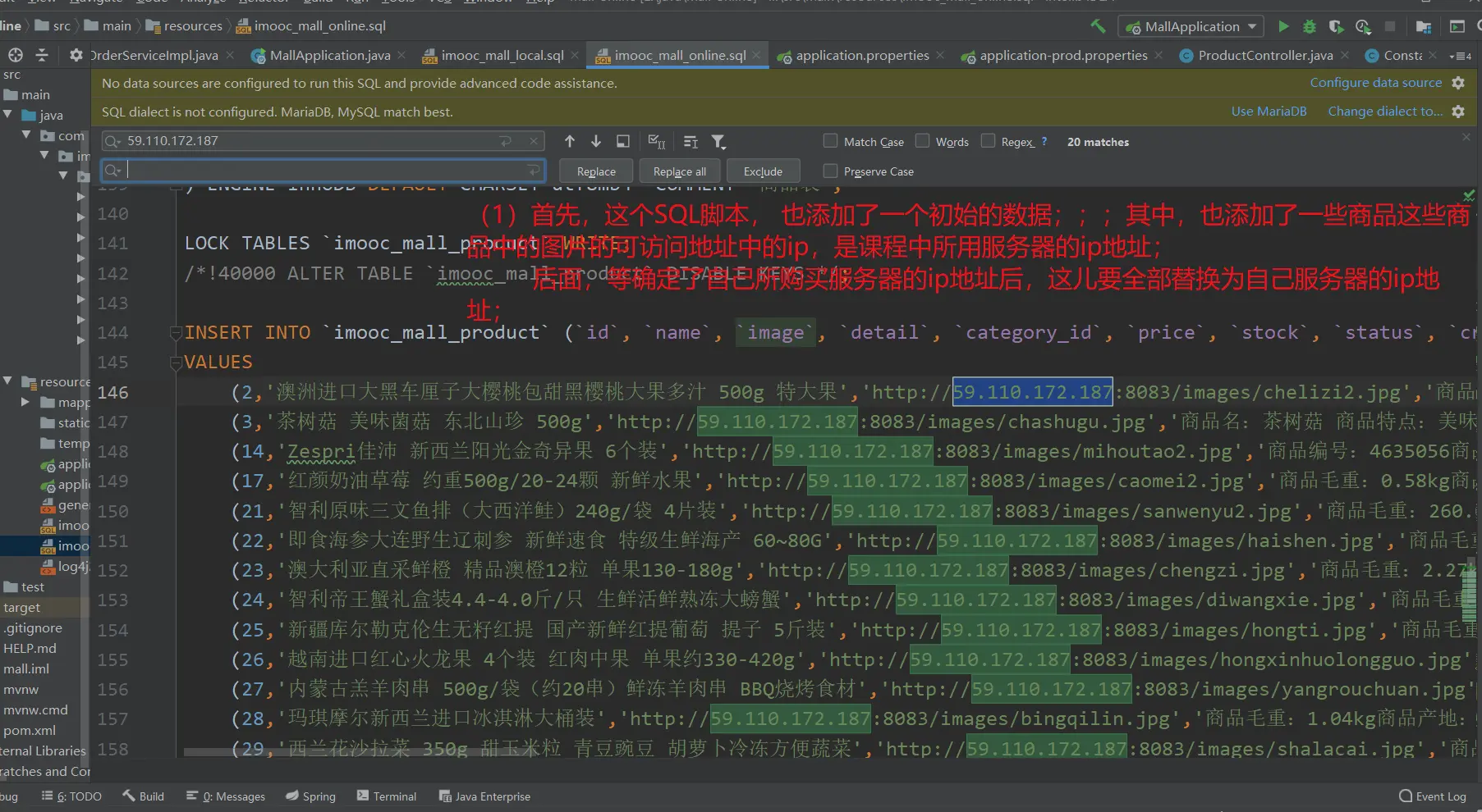 (4)待修改项目:测试数据的、图片可访问地址中的ip地址,需要修改为自己服务器的ip地址;