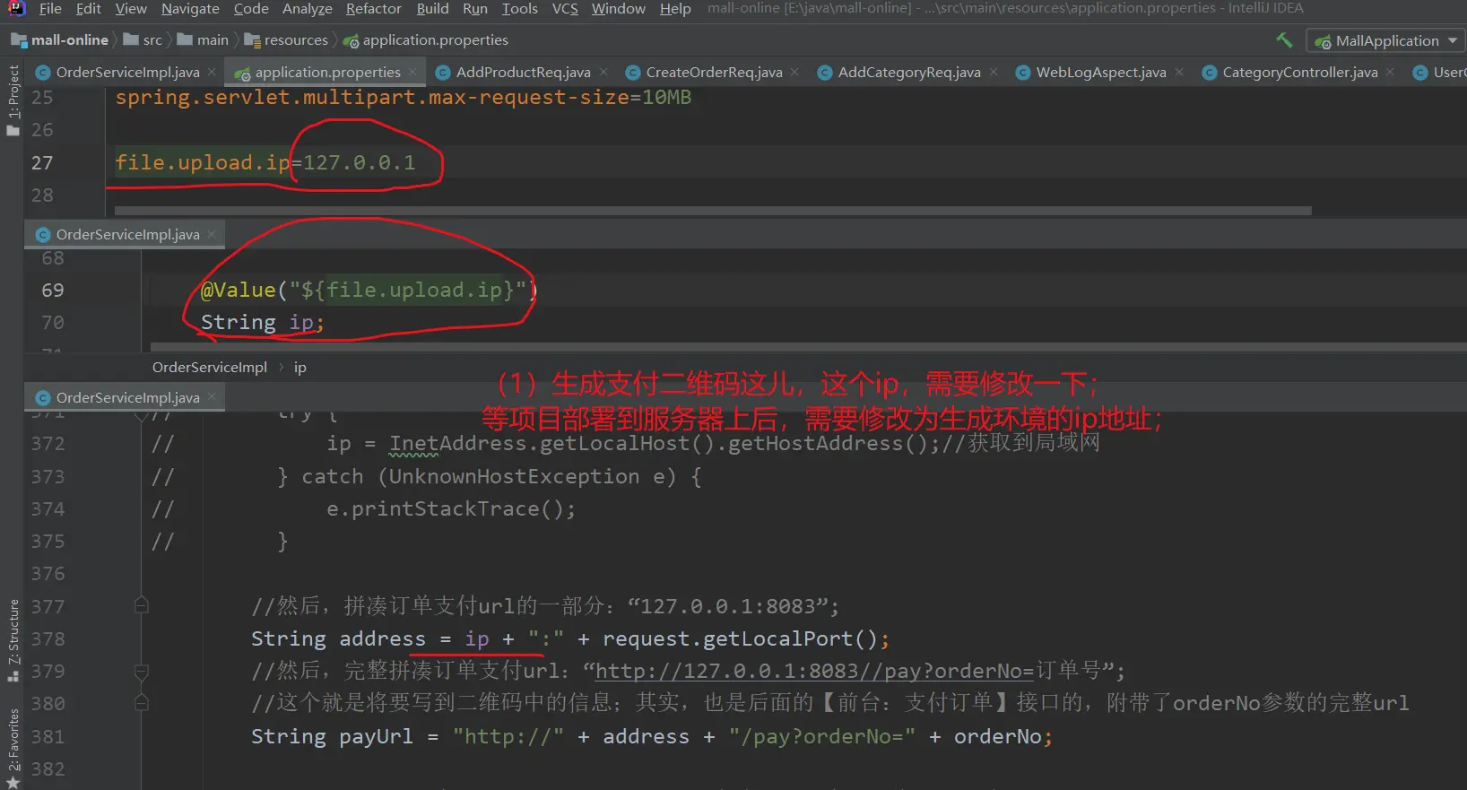 3.一个修改:生成支付二维码的地方,ip需要修改为生产环境的ip;(这个在下面的application-prod.properties,会修改的)