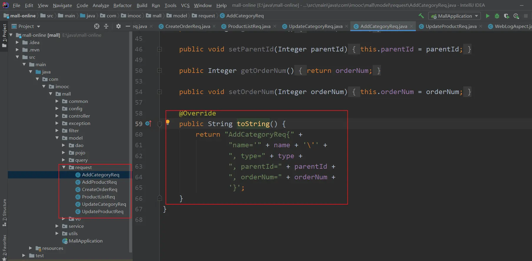 ● 所以,为了在打印【用到了request实体类结接收参数的,方法的,参数】信息时,能明确的看到该实体类参数的具体内容;我们这儿需要重写一下toString()方法;
