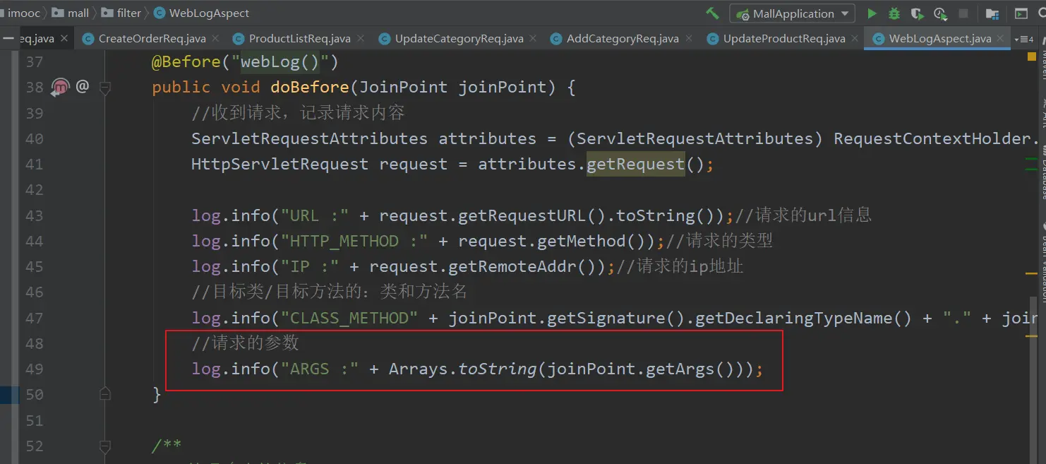 ● 而,在【SpringBoot电商项目数据库表设计】中,我们在打印请求与响应信息的日志时,也打印了方法的参数;