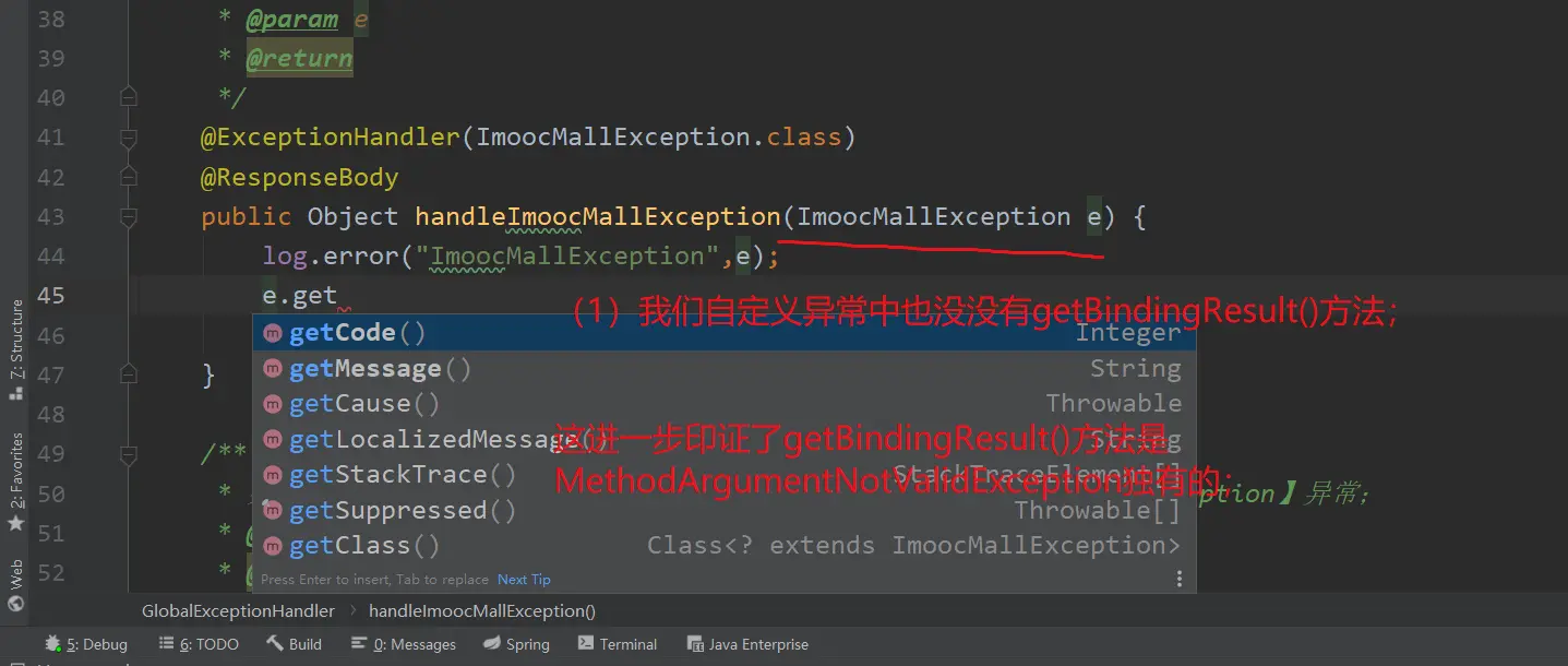 ● 所以,我们在GlobalExceptionHandler中,编写方法,主要内容是:去获取【MethodArgumentNotValidException】异常的具体信息,构建对应的ApiRestResponse统一返回对象;