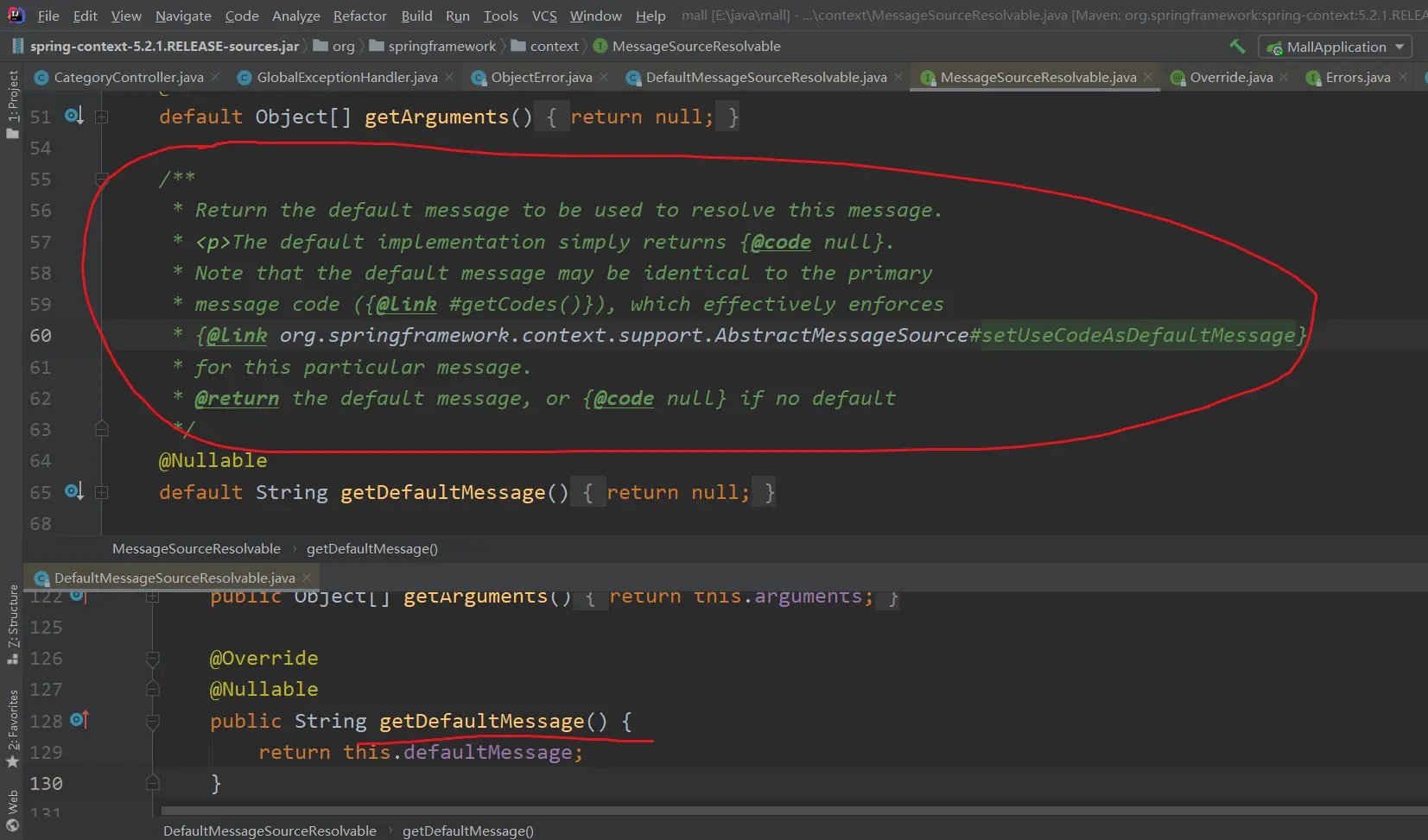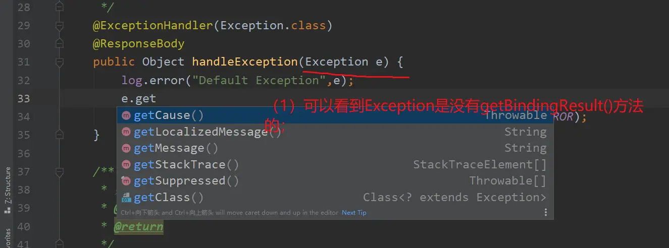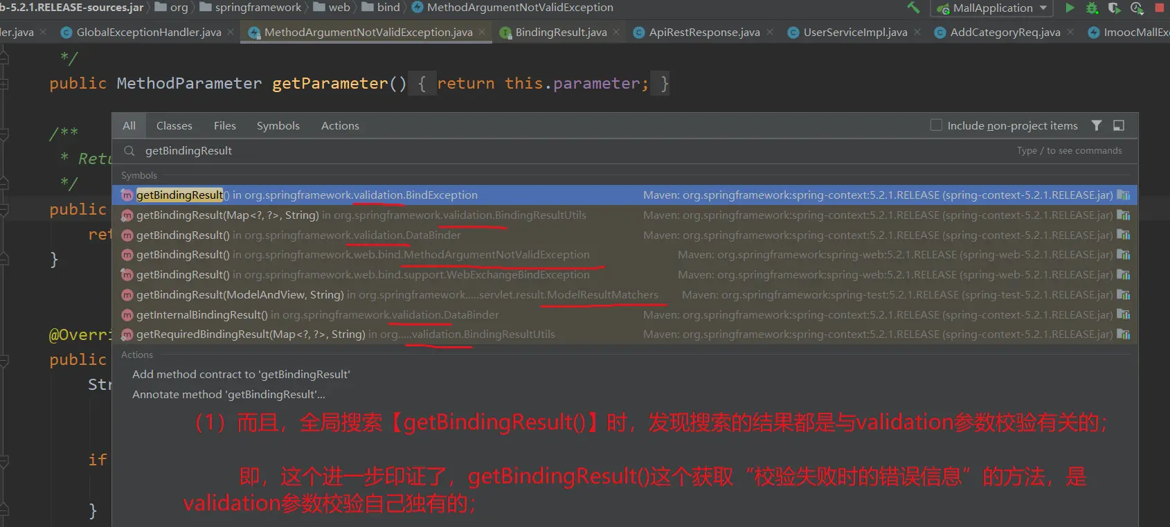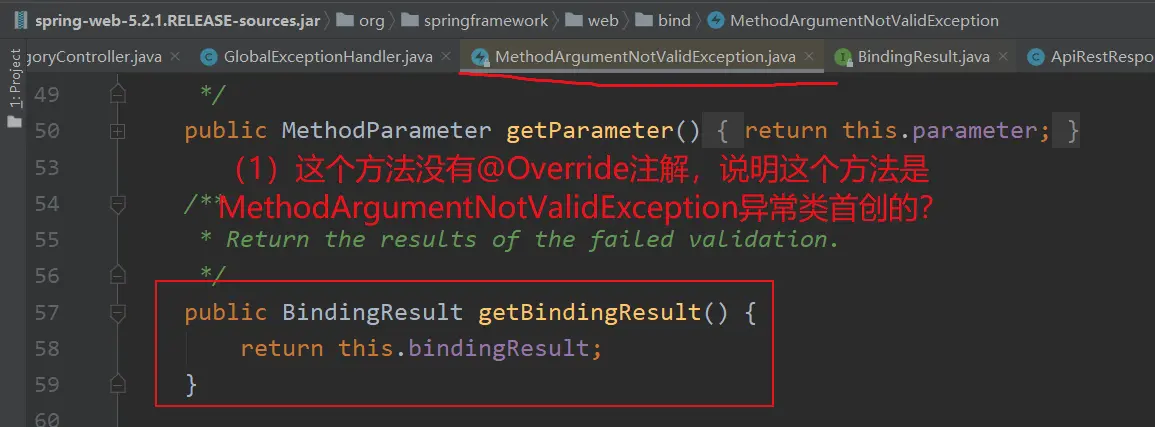 这个方法是MethodArgumentNotValidException异常类中定义的,作用是获取“校验失败时的错误信息”;该方法的返回值类型是【BindingResult】;(而且,目前有理由相信,getBindingResult()方法是validation参数校验独有的)