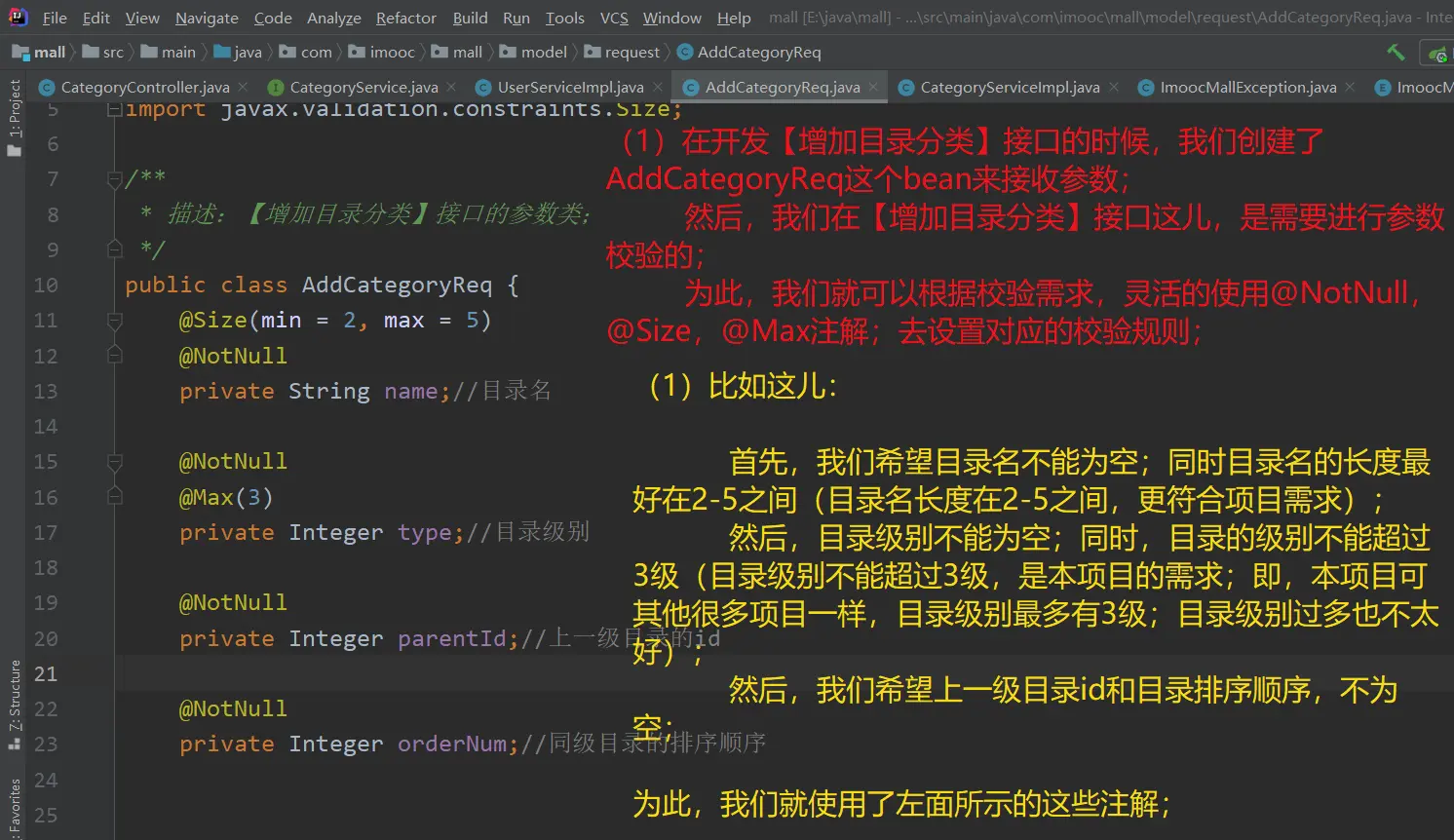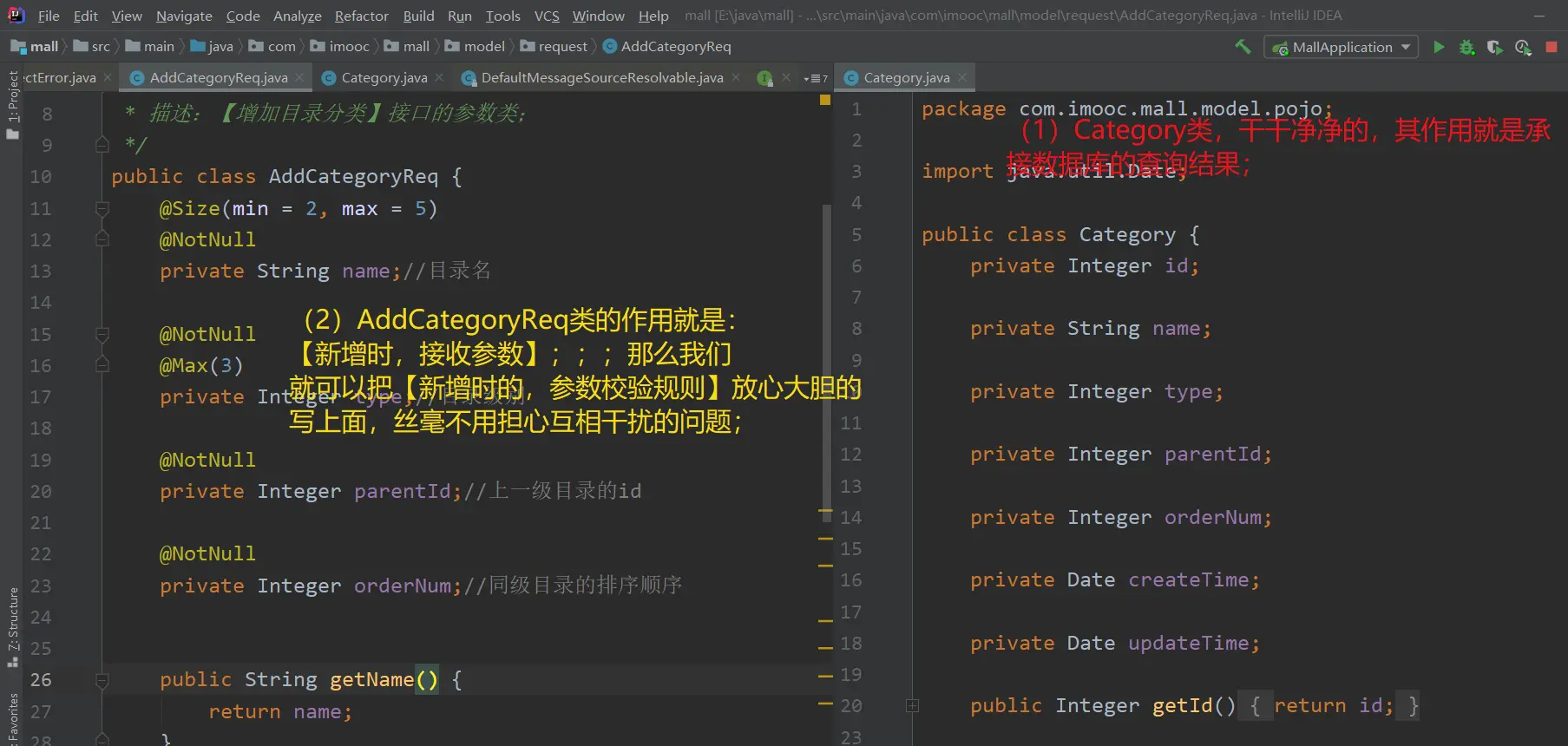 ● 为此,我们就可以创建一个UpdateCategoryReq类,然后我们使用UpdateCategoryReq去接收参数;然后,在UpdateCategoryReq定义【修改时,参数校验的逻辑】;