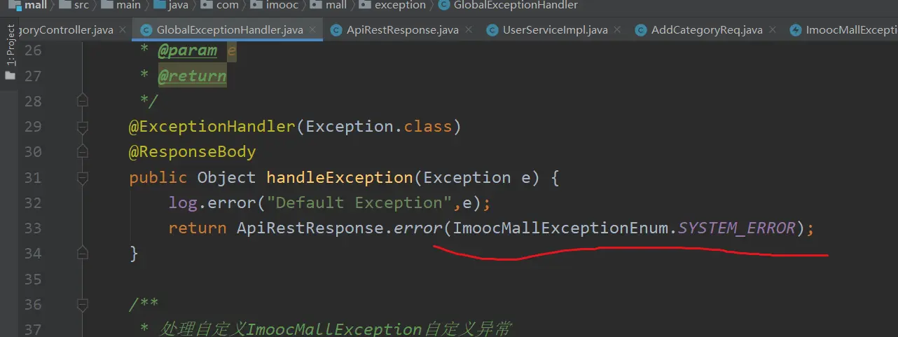 ● 我们也创建了一个兜底的方法,去拦截Exception异常;然后,目前针对这个异常,我们就用【ImoocMallExceptionEnum.SYSTEM_ERROR:系统异常】去构建ApiRestResponse统一返回对象;