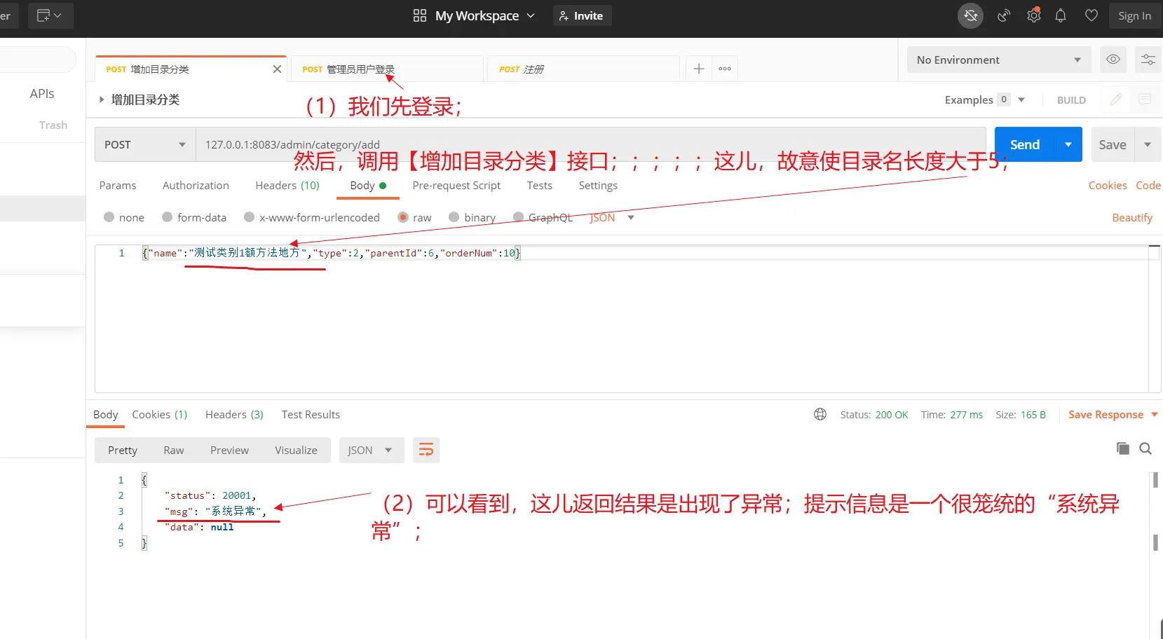 但是,还有个问题:上面出现了错误后,详细的提示信息只出现在了日志中,我们程序员是可以看到的;但是,我们这个商城的用户却不能知道具体的错误原因,商城的用户只能得到“系统异常”这个笼统的错误信息;