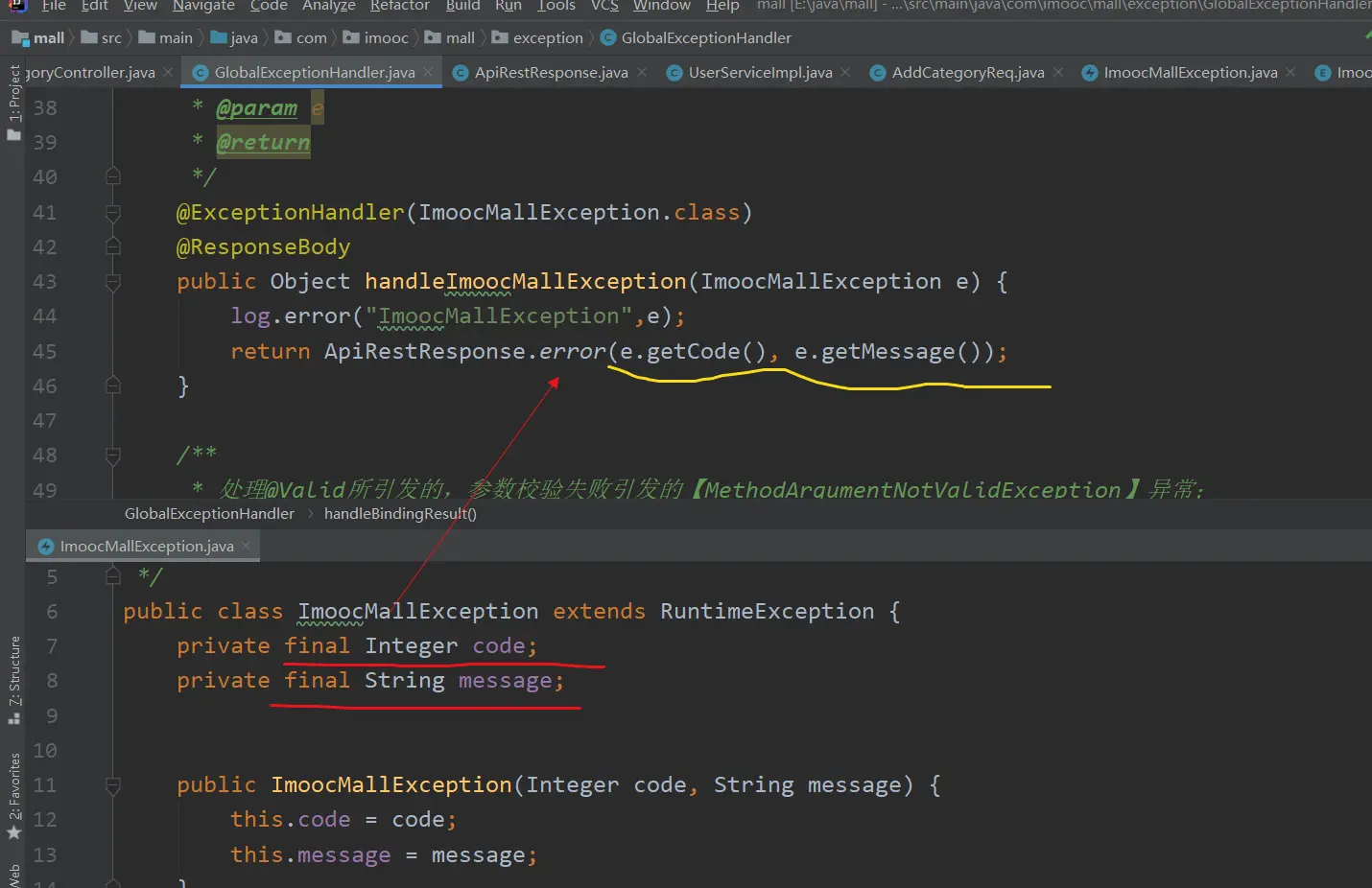 ● 前面的ImoocMallException异常,是我们自己写的,我们是根据接口的返回信息构建的;所以,通过ImoocMallException异常的信息,我们可以快速构建ApiRestResponse统一返回对象: