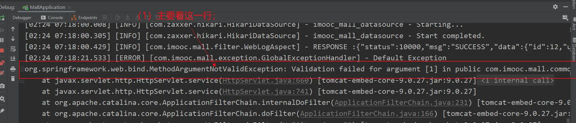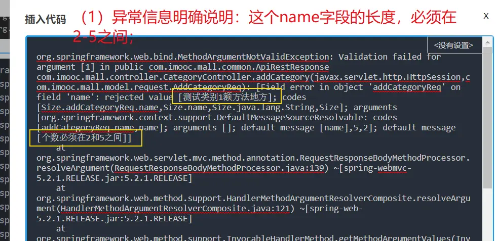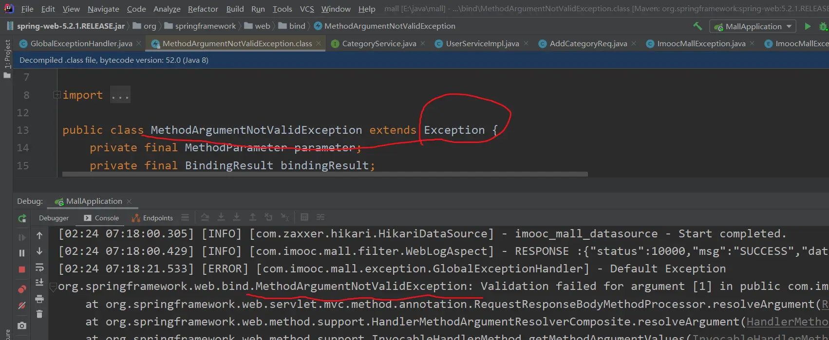 即,如果异常是Exception或者Exception的子异常,但又不是ImoocMallException异常的话;最终的处理结果都是返回【return ApiRestResponse.error(ImoocMallExceptionEnum.SYSTEM_ERROR);】;也就是说,如果系统抛出了【MethodArgumentNotValidException这个继承自Exception的异常】时,是handleException()这个方法处理的;