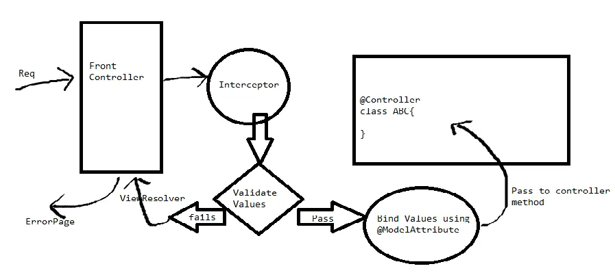 [!评论] Well its a sequential process. The Request first treat by FrontController and then moves towards our own customize controller with @Controller annotation. but our controller method is binding bean using modelattribute and we are also performing few validations on bean values. so instead of moving the request to our controller class, FrontController moves it towards one interceptor which creates the temp object of our bean and the validate the values. if validation successful then bind the temp obj values with our actual bean which is stored in @ModelAttribute otherwise if validation fails it does not bind and moves the resp towards error page or wherever u want.