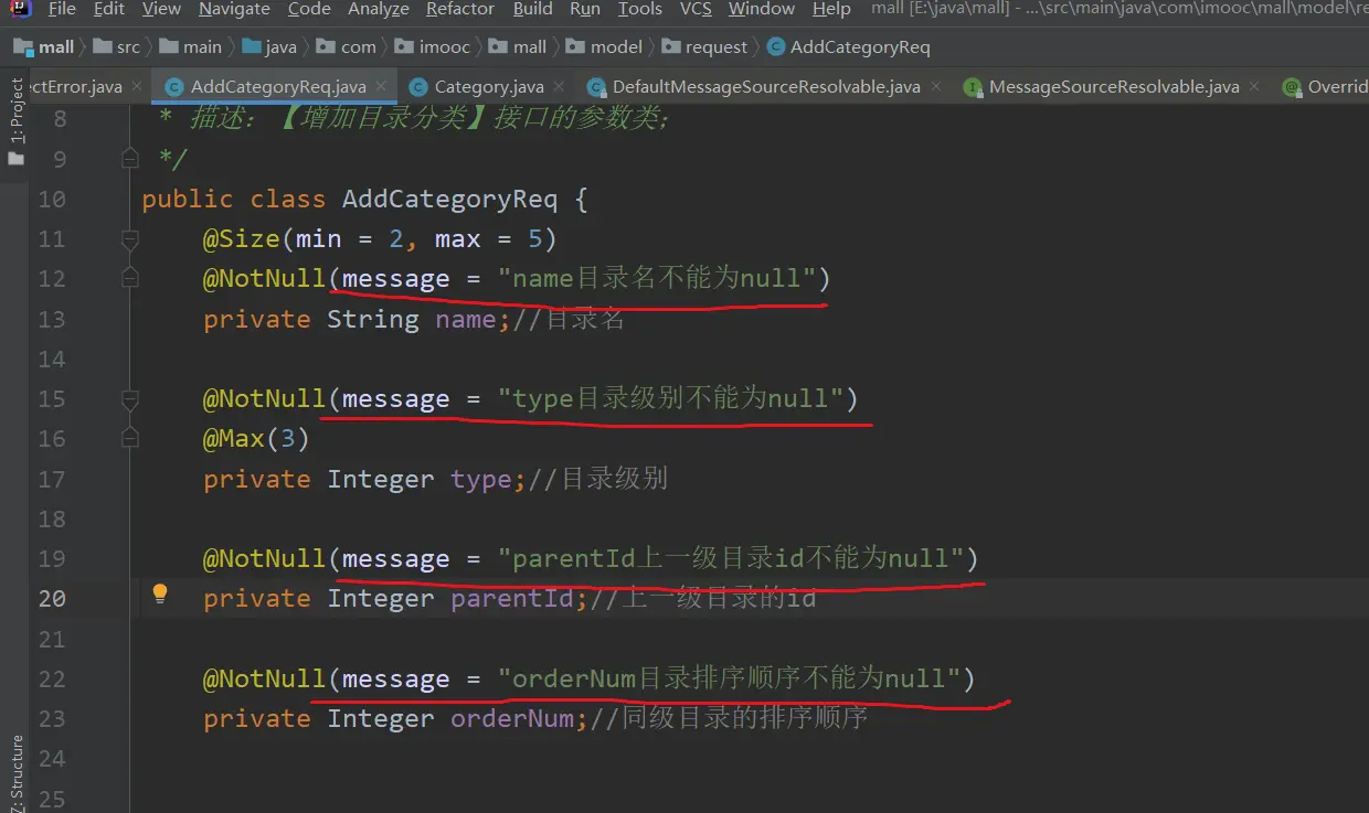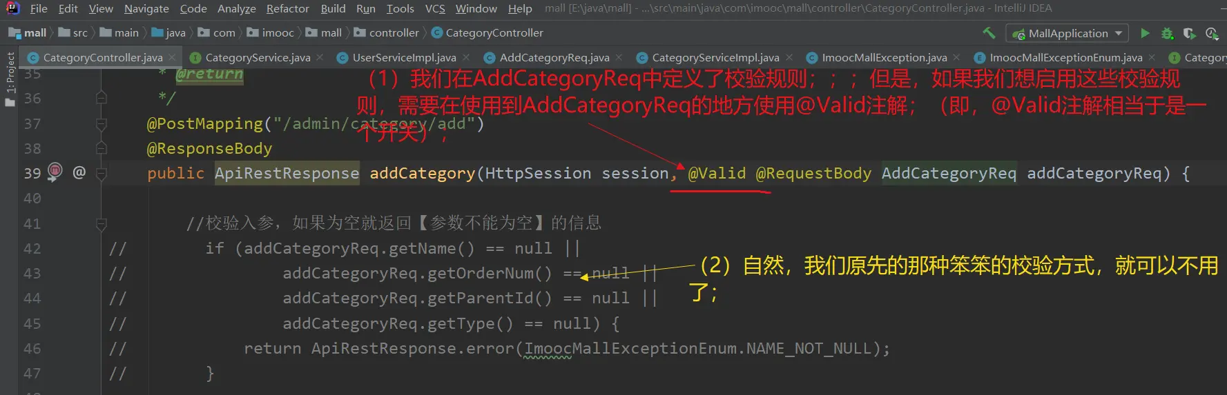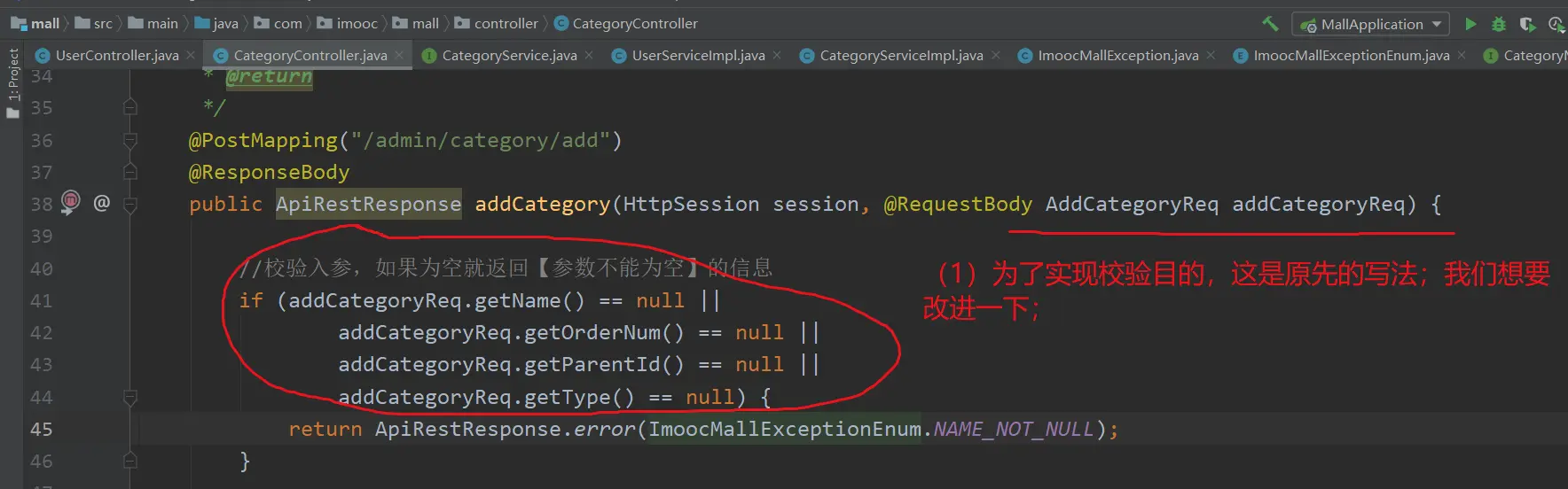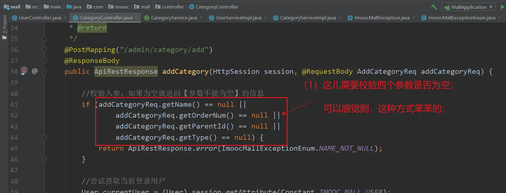 ● 为什么写本篇博客?: 在【SpringBoot电商项目商品分类模块增加目录分类接口】中,Controller处接收参数的时候,当我们通过AddCategoryReq这个bean接收到参数后,我们需要校验下参数是否为空;在这篇博客中,我们采用笨笨的方式去校验;