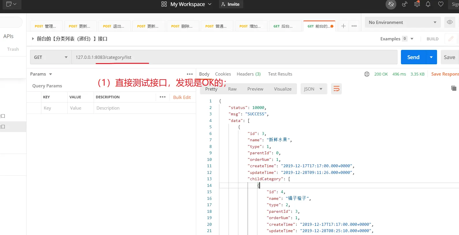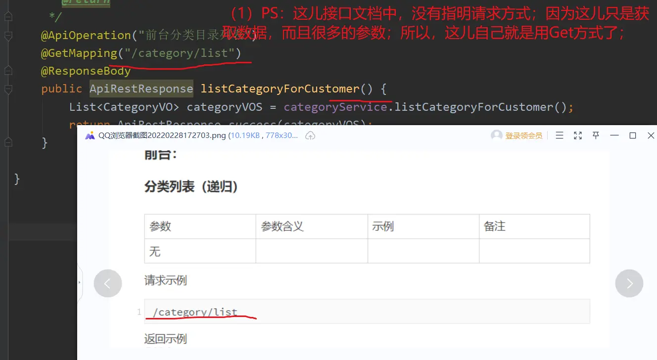 因为,这个接口是前台的,所以这个接口不需要是会员(包括管理员)登录;即,这个接口的url是【/category/list】,没有admin;