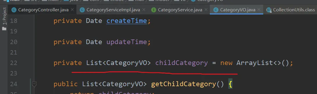 (1)这儿并不是很好理解(但其实还好啦),要仔细看注释;主要是递归查询的思想;以及,每个CategoryVO中的【List <CategoryVO> childCategory】是用来存放,所有对应下级目录数据的;