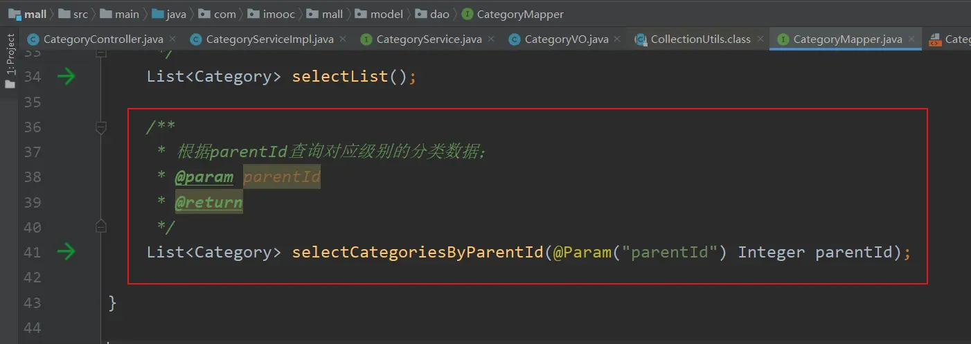 (2) Dao层的selectCategoriesByParentId()方法,是根据parent_id查询对应级别分类数据;具体内容,在下一部分介绍;