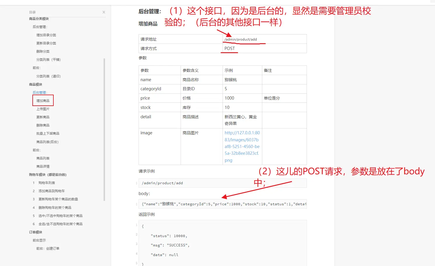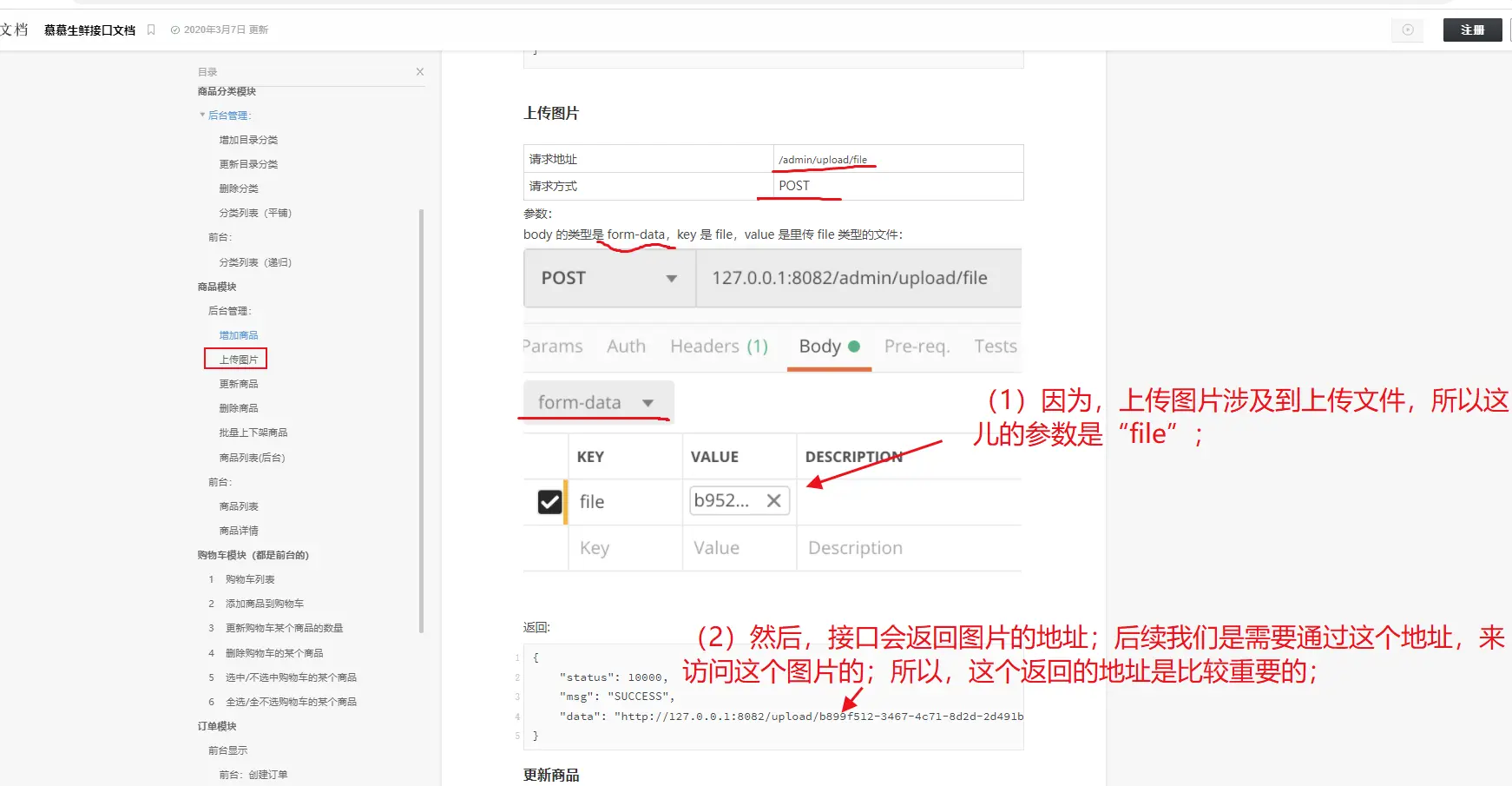 因为在调用【增加商品】接口的时候,需要上传图片;所以,我们也需要开发【上传图片】接口;【上传图片】接口返回给前端,图片上传到服务器后的地址,然后这个地址就会作为【新增商品】接口的image参数;