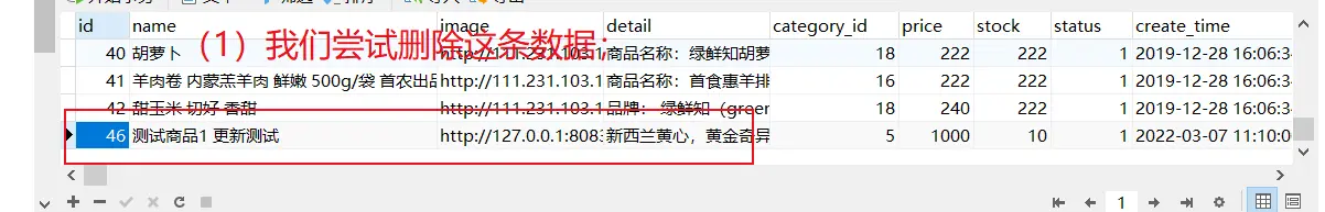 (2)声明: 在实际开项目中,我们不太推荐使用【删除商品】;这是因为,为了保留数据库的信息的沉淀,我们尽量不会去删除这些数据;其实,在业务中,对商品进行下架,就是一种变相的软删除,而且其可以保留历史信息;