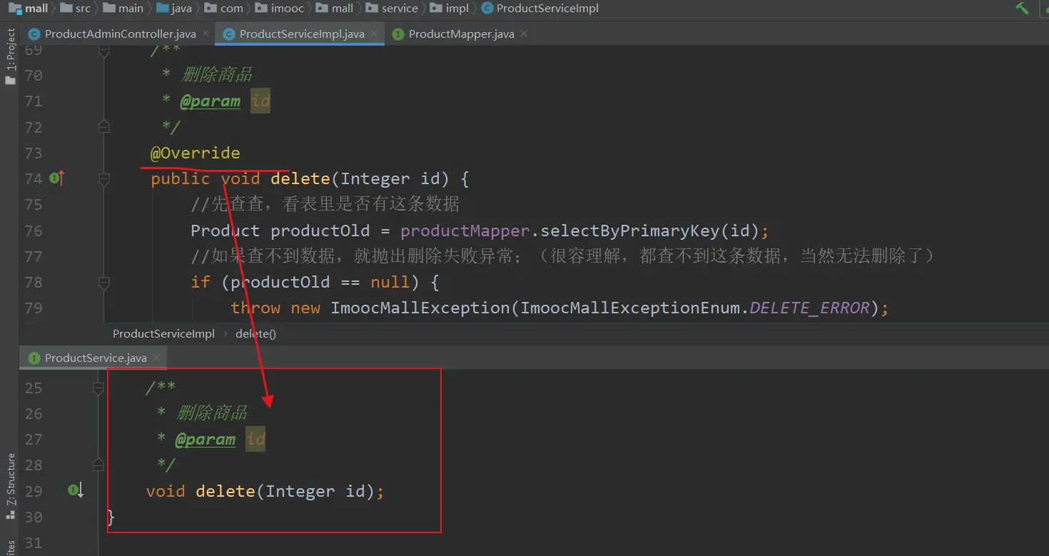 2.在ProductServiceImpl实现类中,编写删除商品的方法delete();然后在ProductService接口中,反向生成方法的声明;
