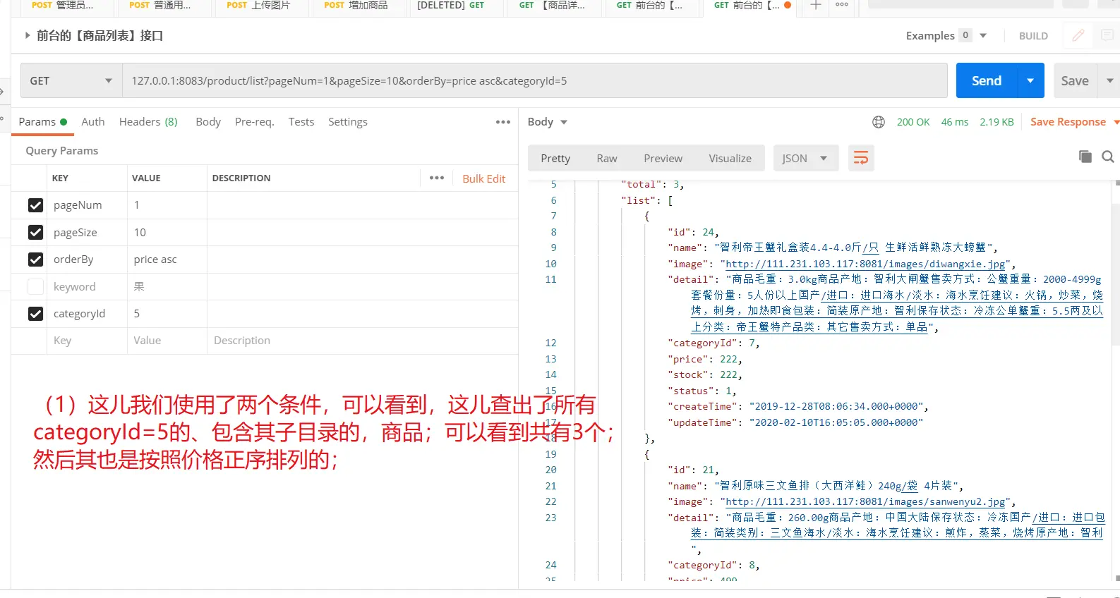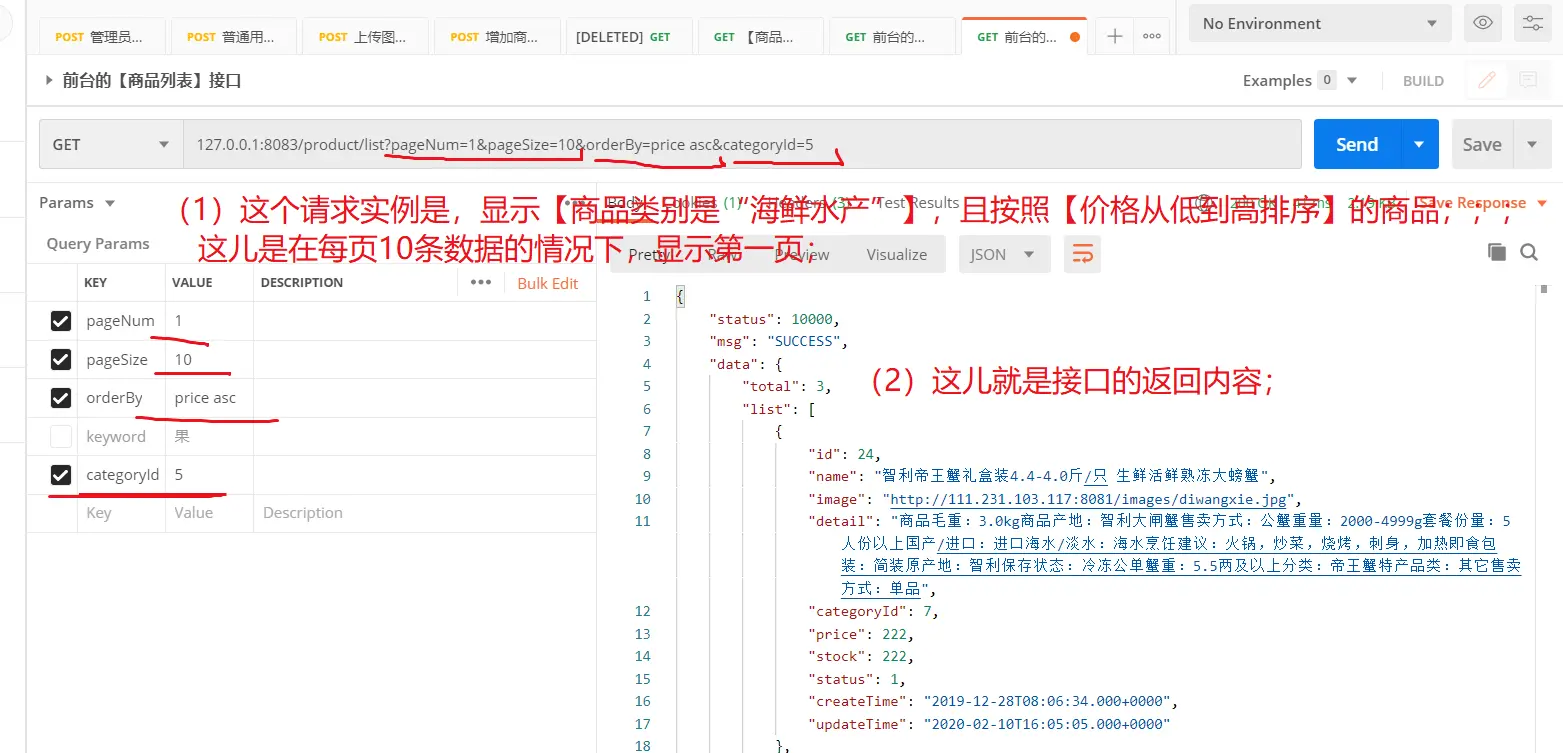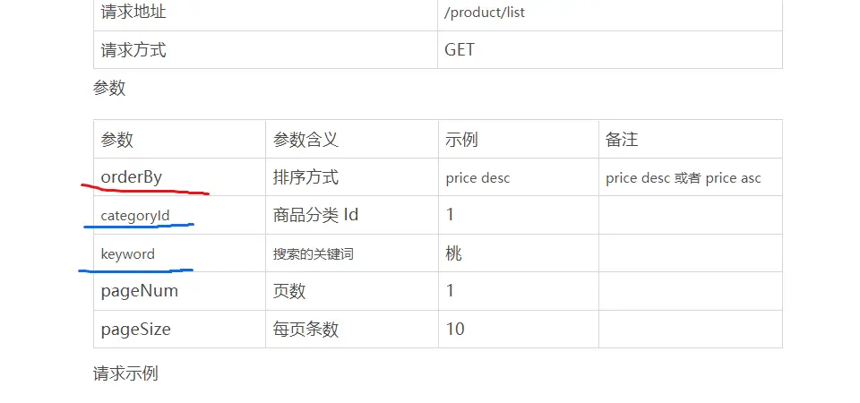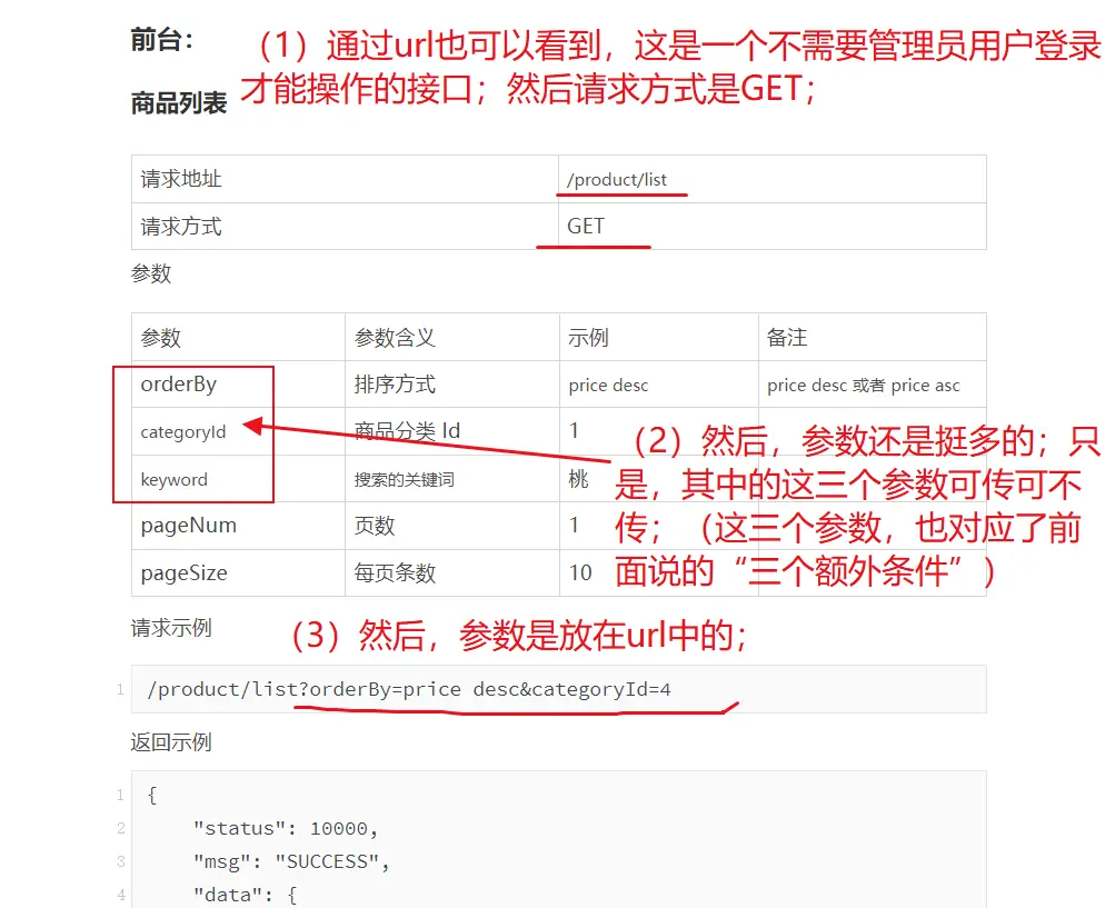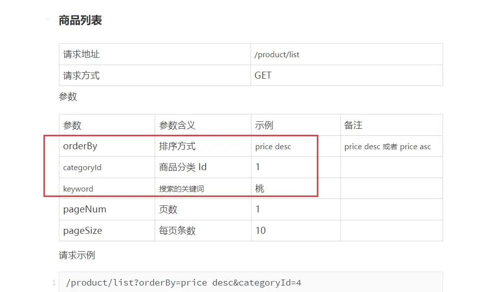 以这个请求实例为例,来仔细说下前台的【商品列表】接口文档;