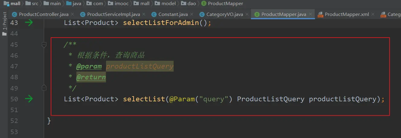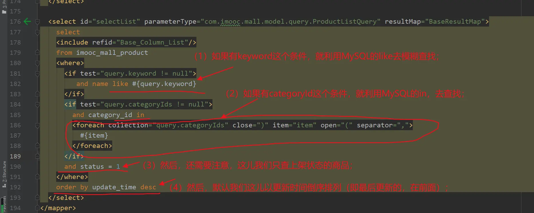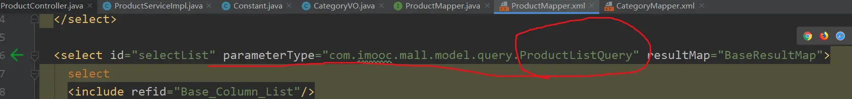 (1) 入参需要是我们的Query查询类:parameterType=“com.imooc.mall.model.query.ProductListQuery”;