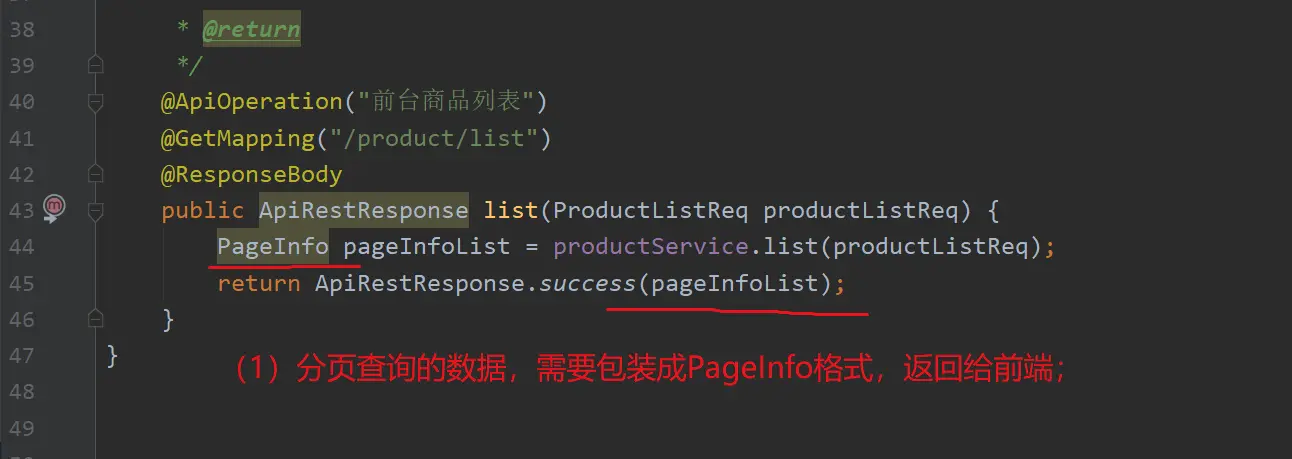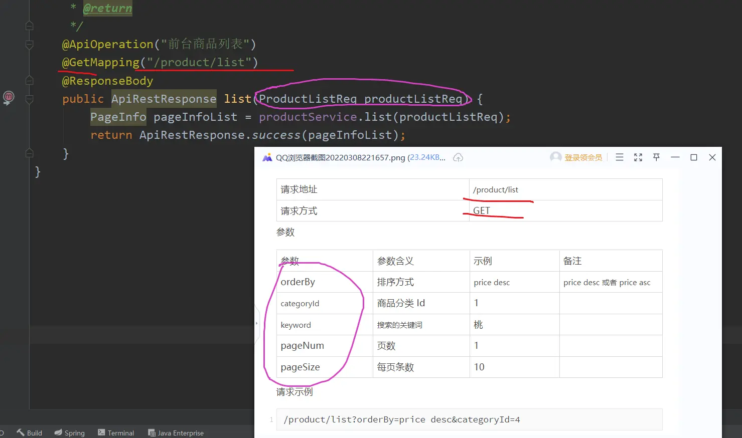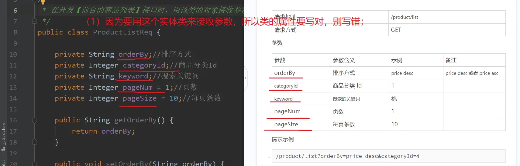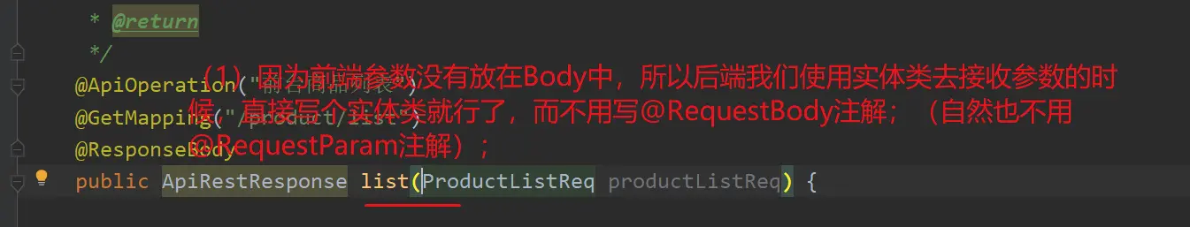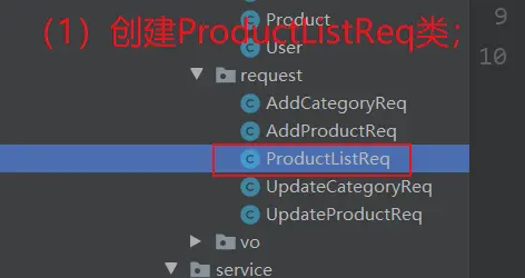 (1)因为前台的【商品列表】接口的参数很多,所以我们创建了一个实体类ProductListReq类,用这个实体类来接收参数;