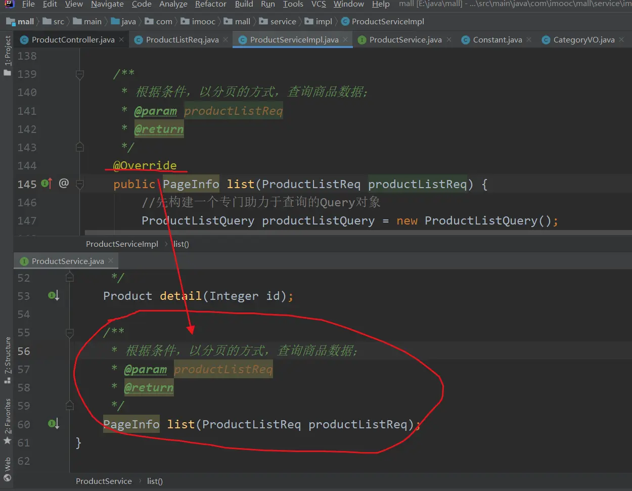 1.在ProductController类中,创建查询前台的商品列表的方法:list()方法;