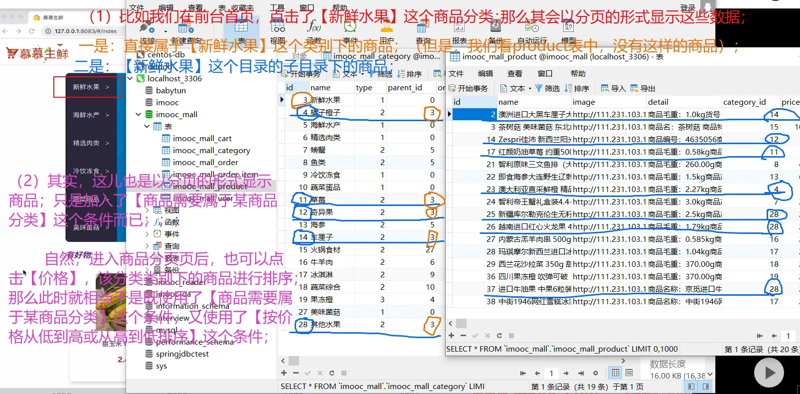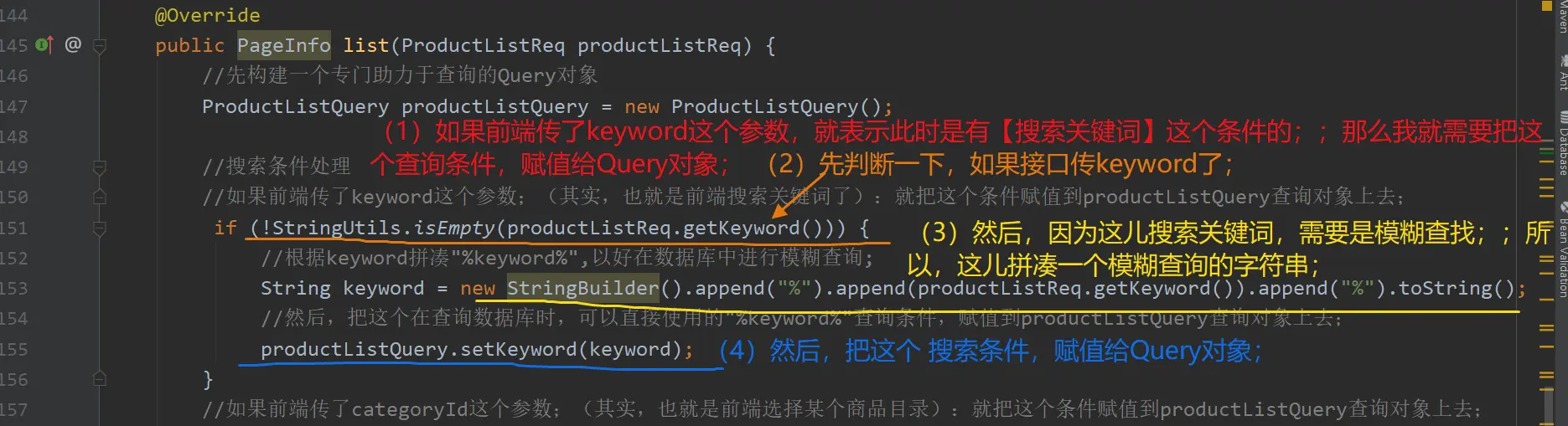 也就是说:【如果在界面上,我们点击了“新鲜水果”后】→【就相当于我们传了categoryId=3,这个参数】→【就表示,我们此时加入了categoryId=3,这个搜索条件】→【这个条件经过处理,等到具体查product表的时候,就变成了:category_id在{3,4,11,12,14,19,28}的商品了】; 其实,这样一看,这个查询条件还是比较复杂的,由这儿也能感受到【专门构建查询条件的Query对象】的好处;