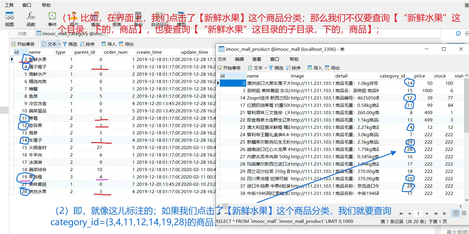 PS:上图少标注了一个,id=19的果冻橙这个分类,是id=4的橘子橙子这个分类的子目录;;;所以,id=36的四川果冻橙要需要查询出来;