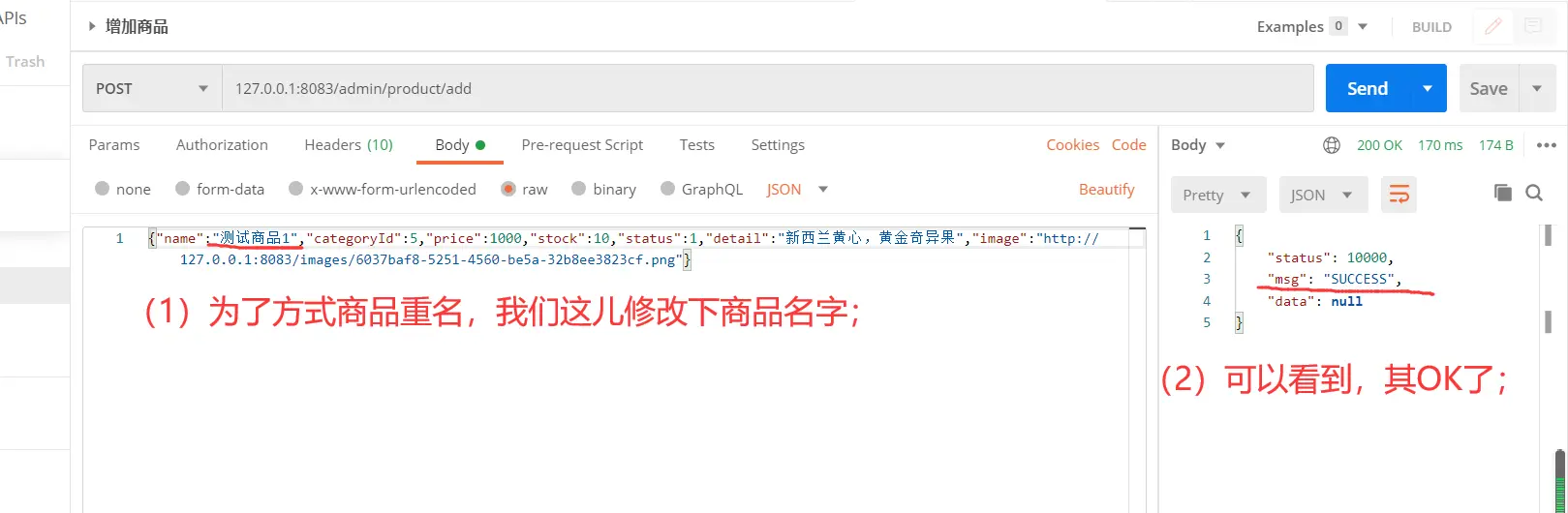 然后,这儿仅仅出于出于测试【增加商品】接口;这儿先不涉及后面的【上传文件】,所以为了省事,不用自己写JSON,我们可以直接复制接口文档中的内容;(PS:等到后面开发了【上传图片】接口后,这个image属性需要是,【上传图片】接口返回给前端的那个地址;这儿,我们仅仅演示【增加商品】接口,所以这儿我们就暂时伪造了一个实际上不存在的image属性)