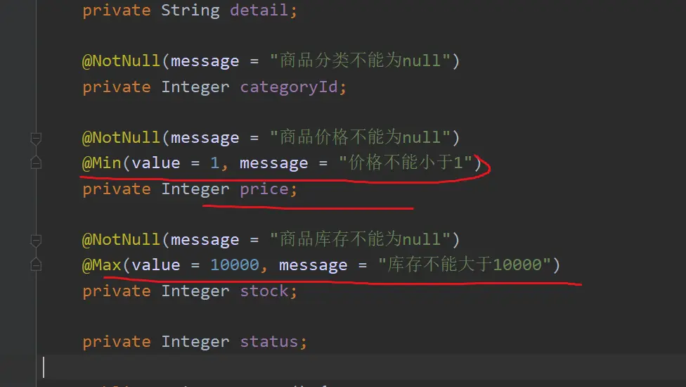 ● 又比如,我们要求price不能低于1分,stock库存不能超过10000;否则就给出对应的提示信息;