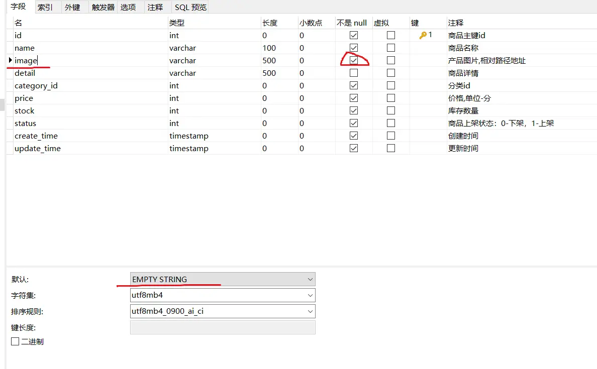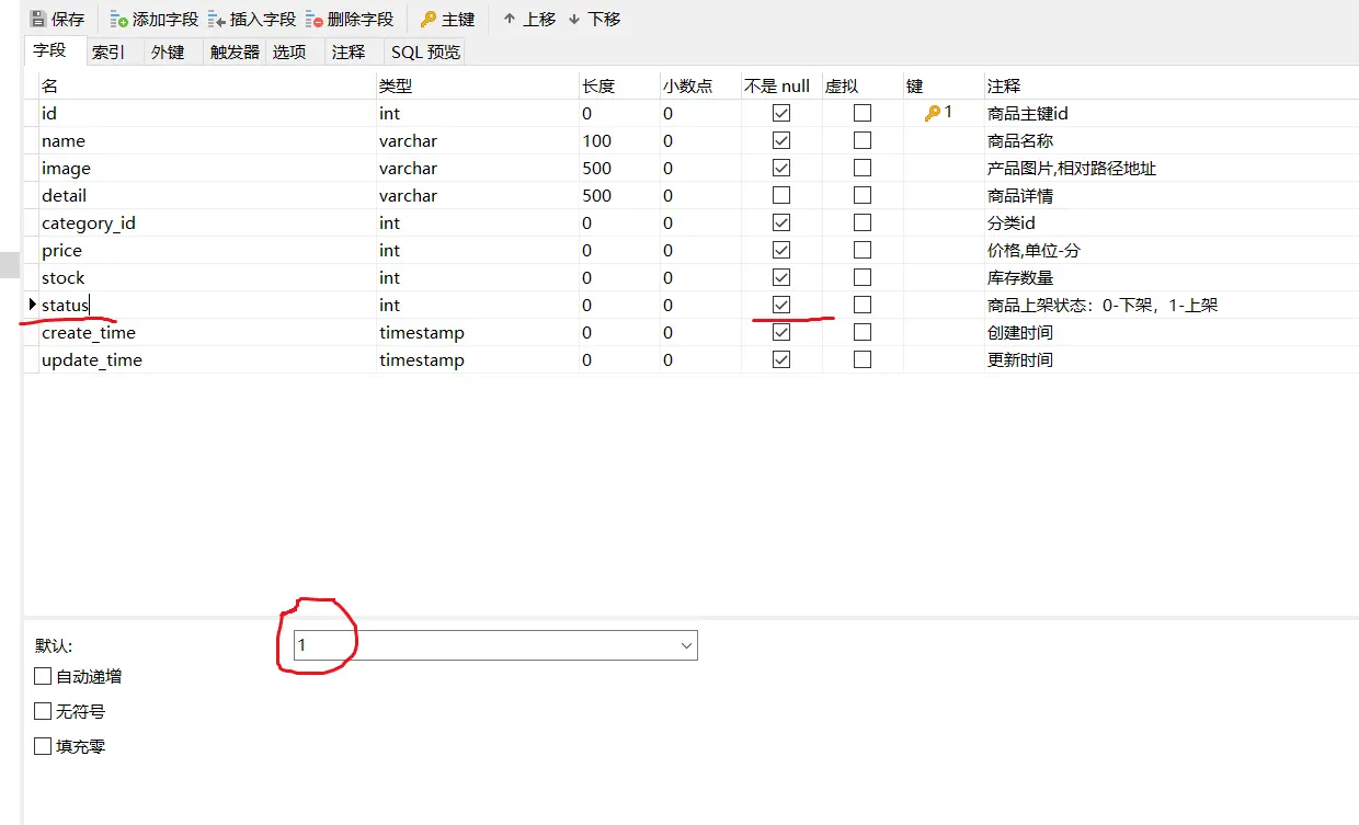● 又比如status,虽然数据库要求是非空,但其设置了默认值;所以,综合业务角度来说,可以不传status,如果不传,我们就使用默认值1就行了;