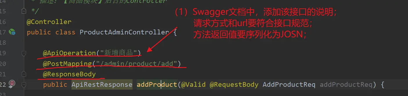 (1)【url、请求方式:要符合接口规范】,【Swagger文档,添加接口说明】,【返回值要序列化为JSON】;