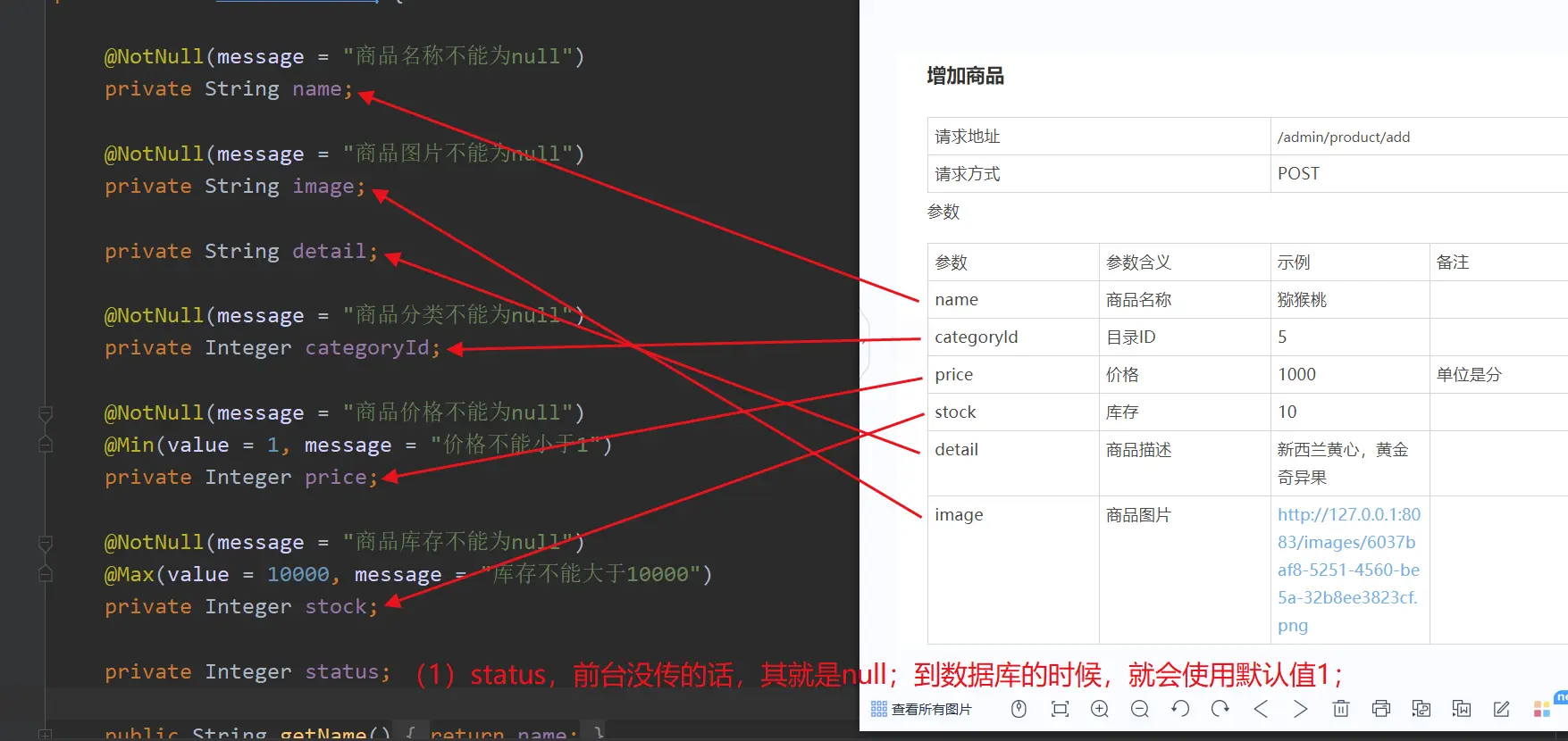 ● 我们即参考了实际的业务需求:比如image;虽然在数据库中这个对应的字段,我们要求不能为null,但是我们是设有默认值的;所以,纯技术来说,这个接口的image参数可以不传;但是,从业务的角度来说,我们又要求用户传image;所以,我们的image也要求不为空了;