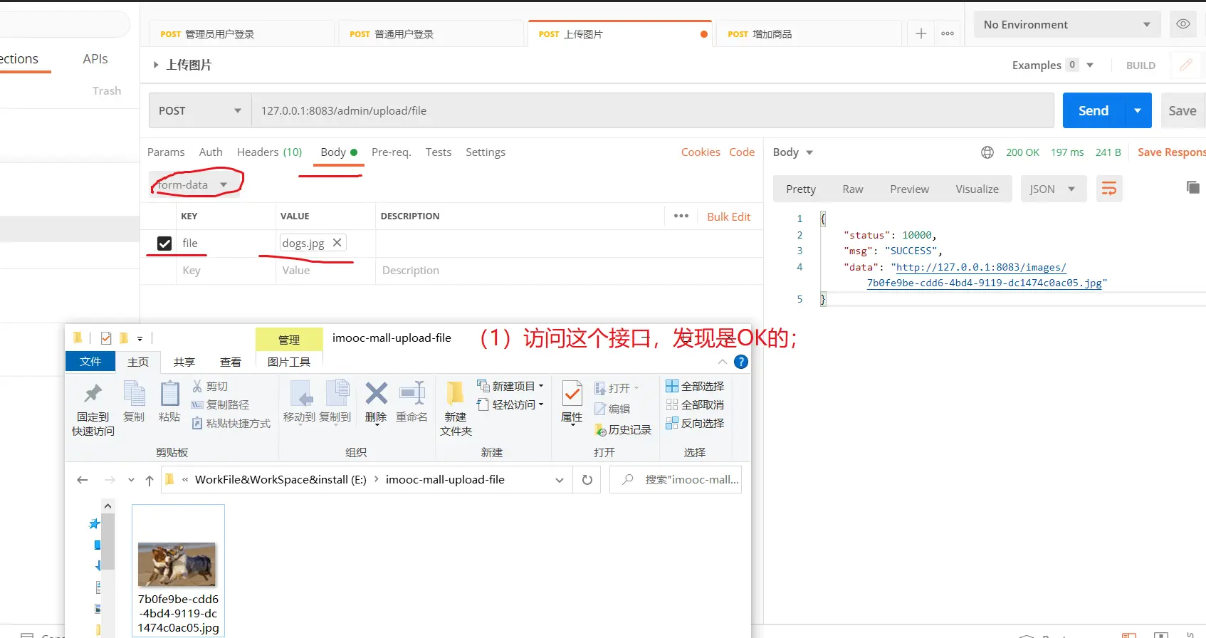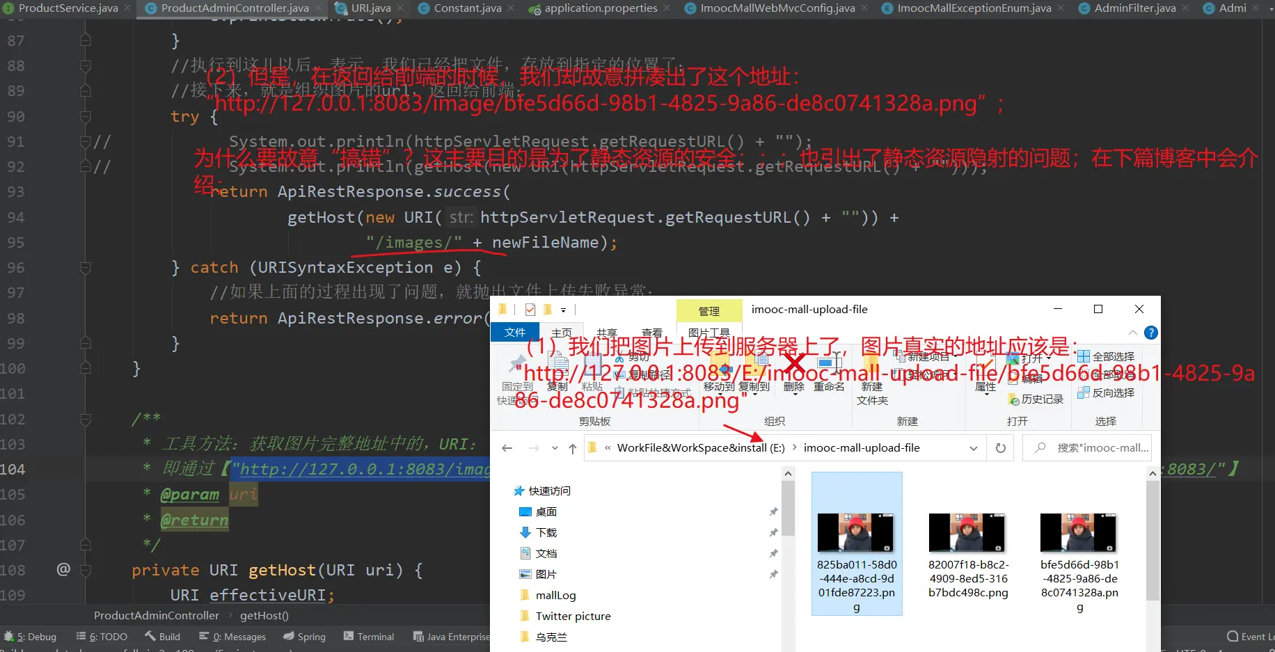 PS:下图可能存在一个描述错误的地方:图片的真实地址:可能并不能说成是 【http://127.0.0.1:8083/E:/imooc-mall-upload-file/7b0fe9be-cdd6-4bd4-9119-dc1474c0ac05.jpg】;而应该说成是【http://127.0.0.1:8083/,这台服务器的本地的E:/imooc-mall-upload-file/7b0fe9be-cdd6-4bd4-9119-dc1474c0ac05.jpg这个位置】;(PS:关于,这其中的区别,自己并不是很清晰)