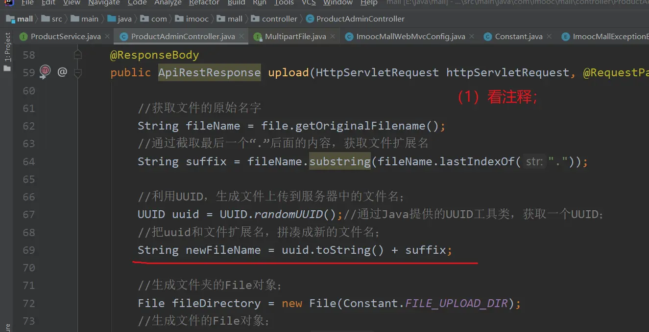 (4)代码逻辑说明:使用【MultipartFile.getOriginalFilename();】去获取原始文件名;使用【UUID.randomUUID();】创建文件名;