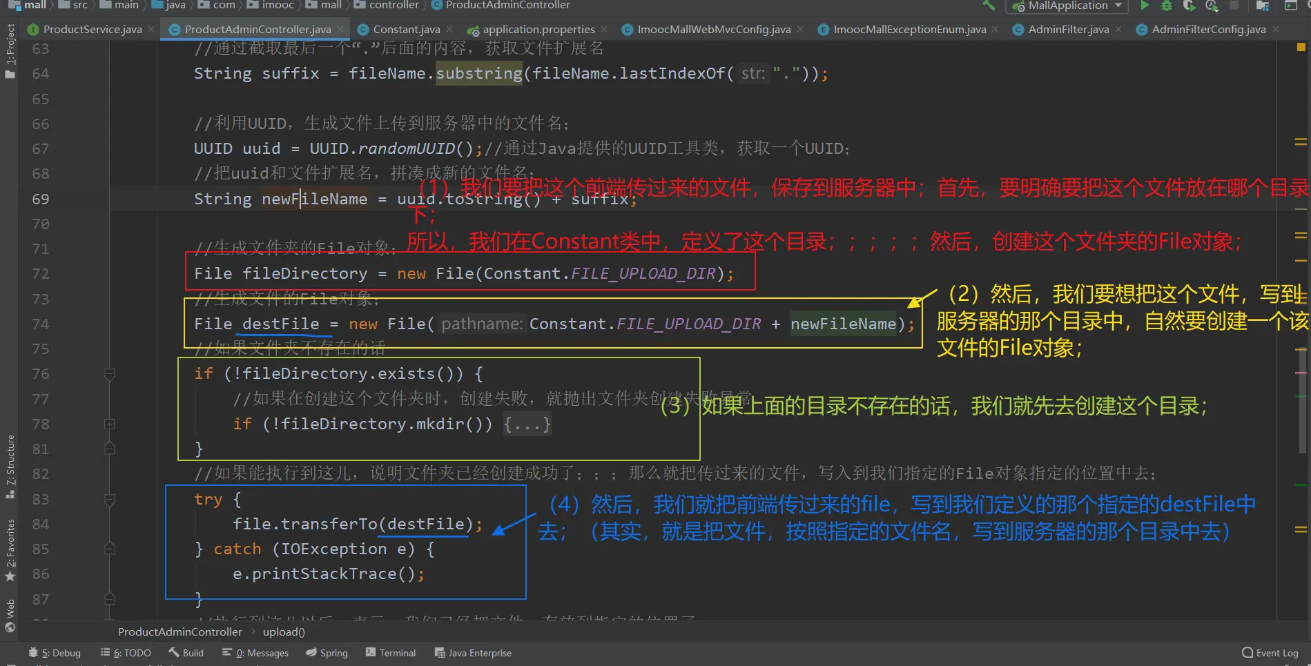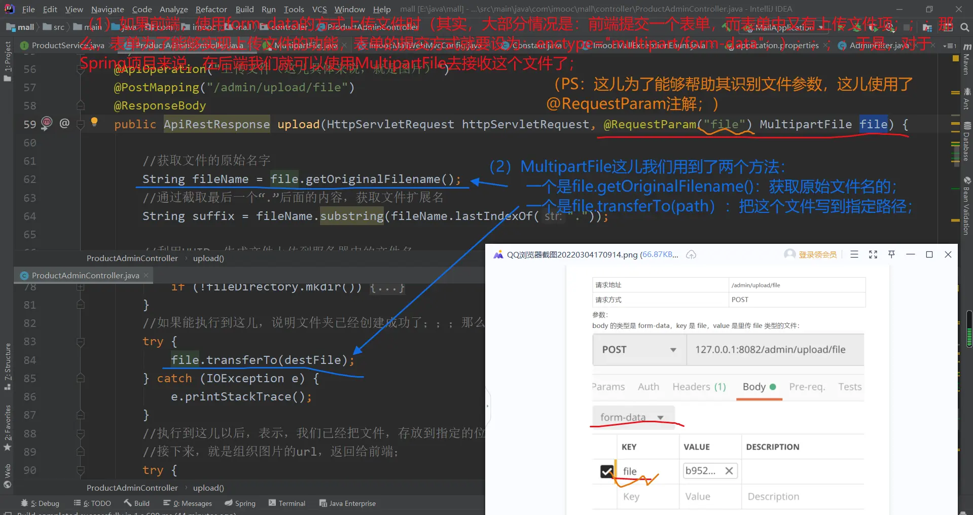 二:开发【上传图片】接口:在ProductAdminController中,创建上传图片的方法:upload()方法;