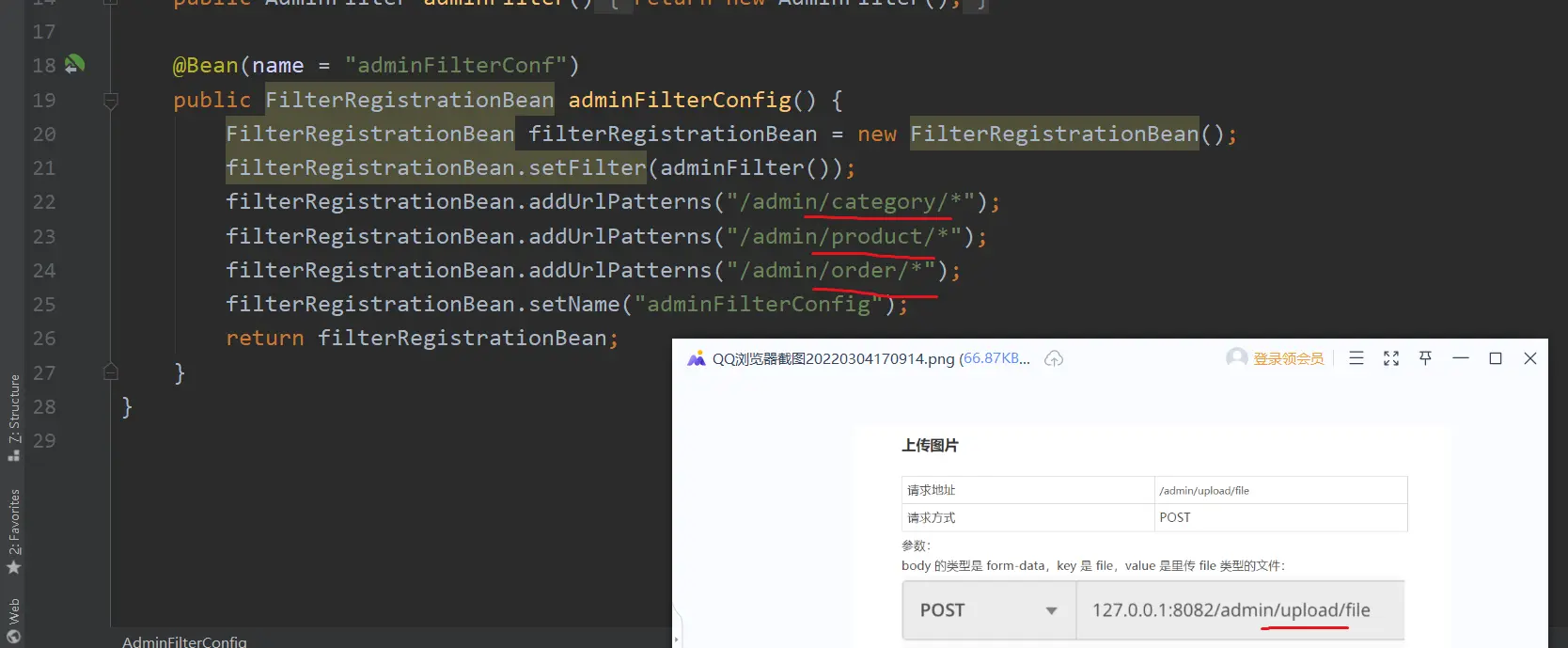 (2) 虽然这个接口的url中有admin,但是只访问这个接口时,可以不是管理员用户登录的状态;而且,我们在【SpringBoot电商项目商品分类模块统一校验管理员身份】中配置的时候,也没有配置【/admin/upload/file】这个地址;
