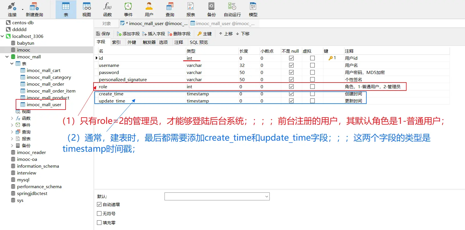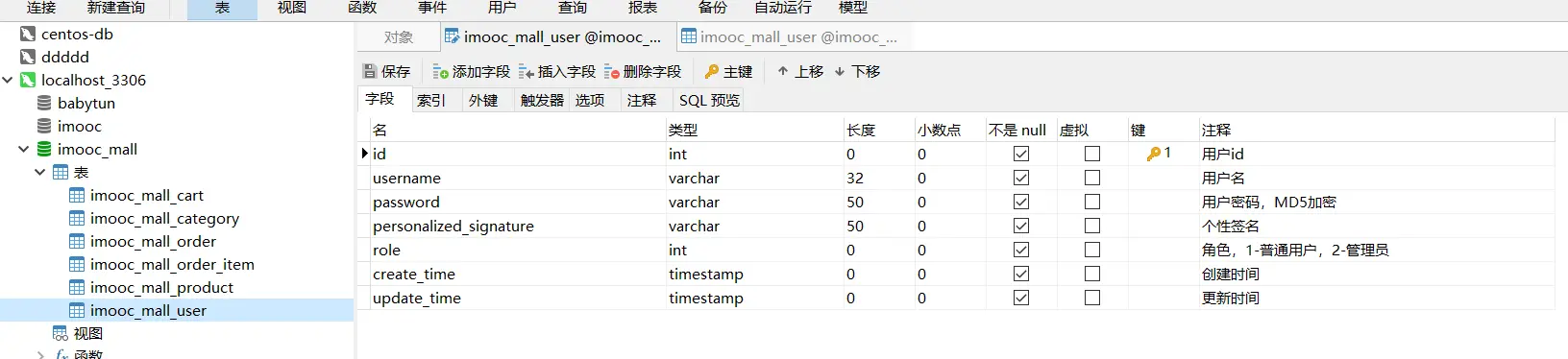 (1) 这个表以user结尾,很容易知道这个表就是用户表;但是,虽然这个表里面会存放多个user,但是这个表的命并不是imooc_mal_users;
