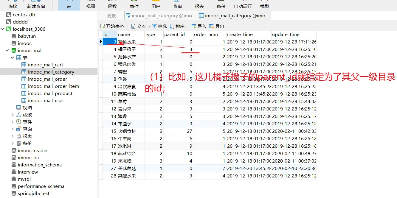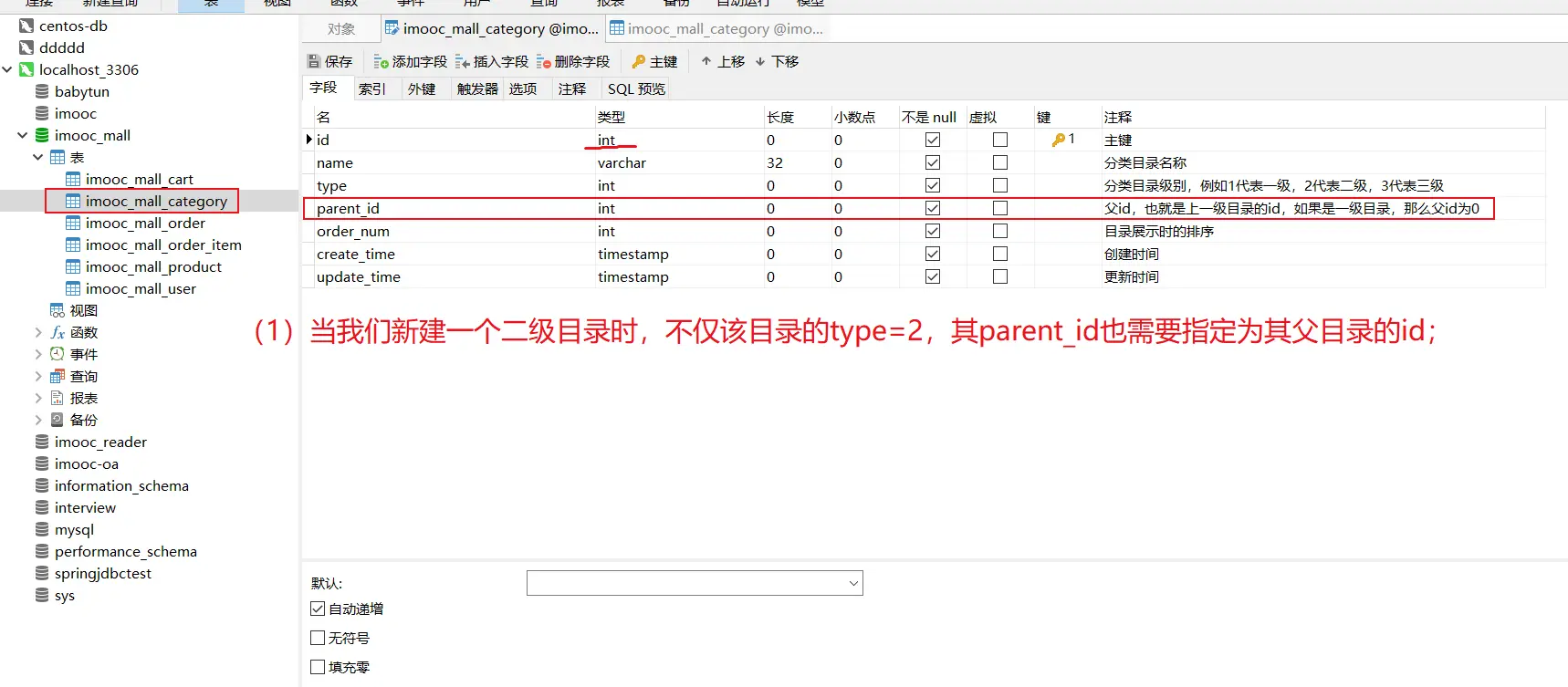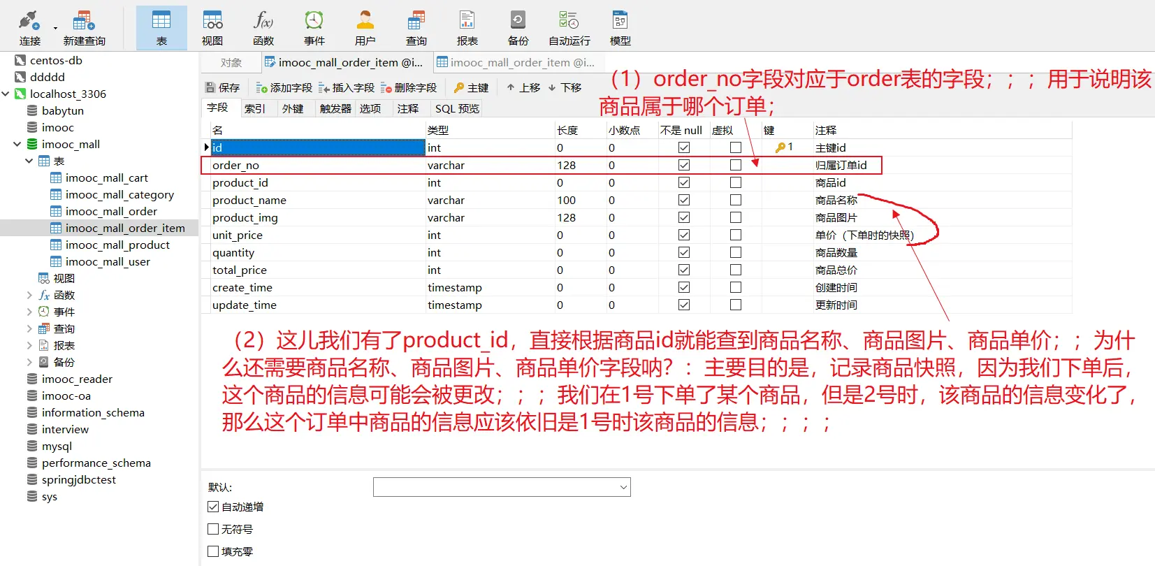 说明:可以设想一下,比如我们下了一个订单,这个订单内容就是我们买了东北大米和帝王蟹两个商品;除了在imooc_mall_order表中新增一条记录来记录这个订单的状态外;似乎,还需要一个表来记录这个订单中的东北大米和帝王蟹这两个具体项目数据的表;由此,就引出了下面的imooc_mall_order_item订单项目表;